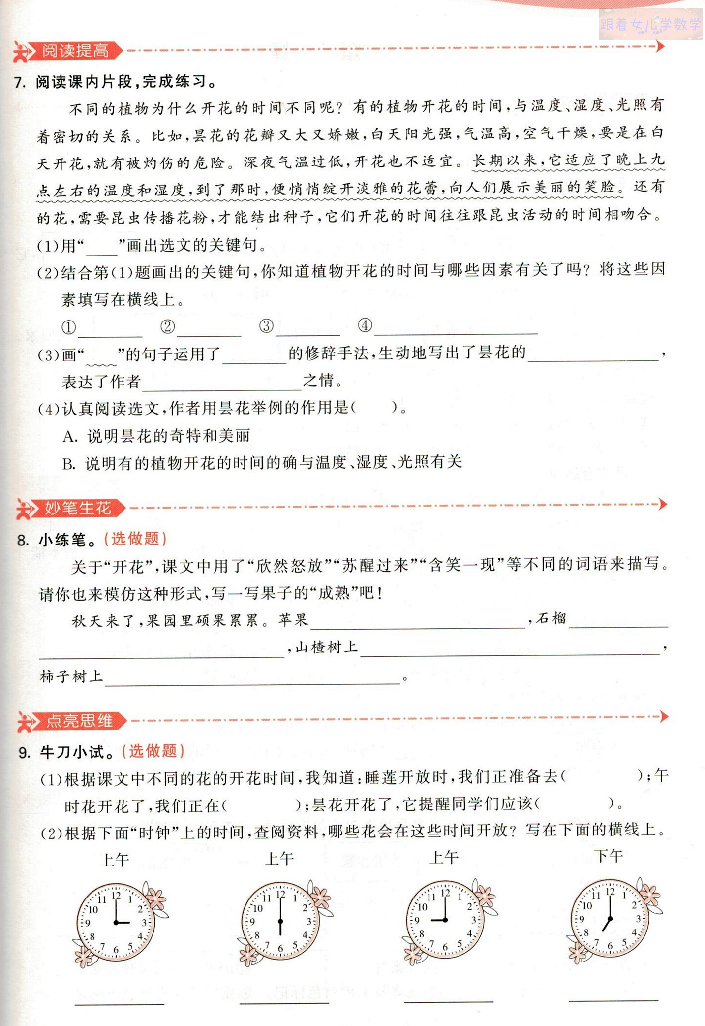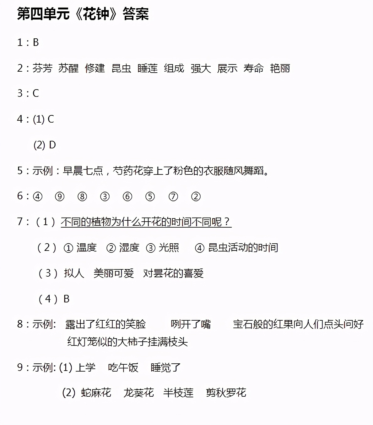 9. 第(1)题考查灵活运用知识的能力。我们可以把花开放的时间和自己的生活规律联系起来,以便记忆。如睡莲是七点左右开花,此时我们正准备上学;午时花是中午十二点左右开花,这时我们正在吃午饭;等等。第(2)题考查搜集资料的能力。首先明确每个钟面上的具体时间,再通过查资料等方式了解哪些花是在这些时间开放的。