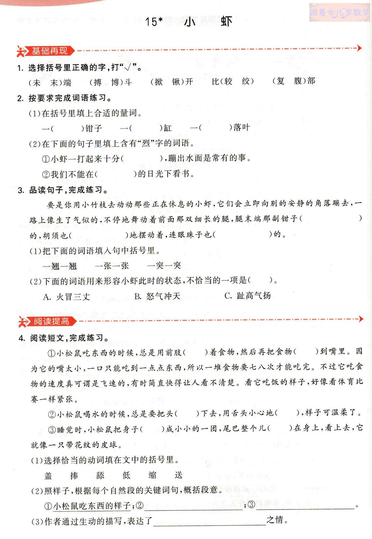 3. (1)本题考查词语搭配。我们可以根据对词语的理解进行填空。理解词语时,可以联系生活实际。如,联系生活可知“钳子”是张开的,“胡须”是翘起的,“眼珠子”是突起的。知道了这些,填空就比较容易了。也可以根据课文内容填空,填完后记得积累下来。(2)本题考查理解句子的能力。这句话写的是小虾生气的具体动作,因此C项错误。