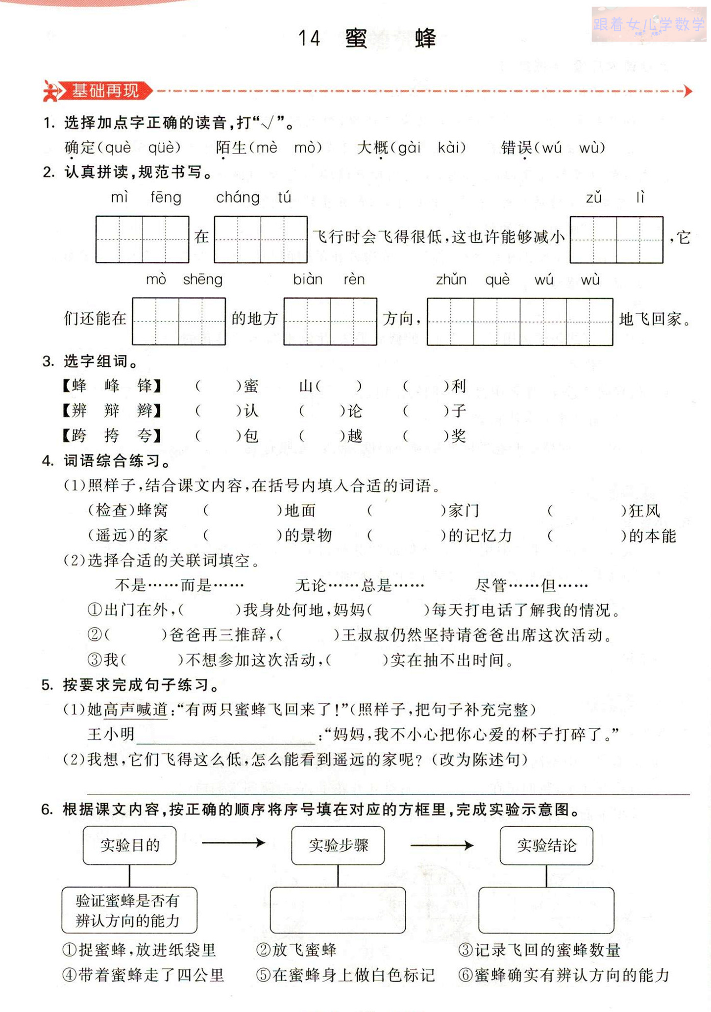 6. 本题考查对课文内容的理解。作者的实验结果是确定了“蜜蜂有辨认方向的能力&34;,所以⑥是结论。课文第2~7自然段写了实验的经过,我们可以从中依次筛选出关键步骤,完成练习。