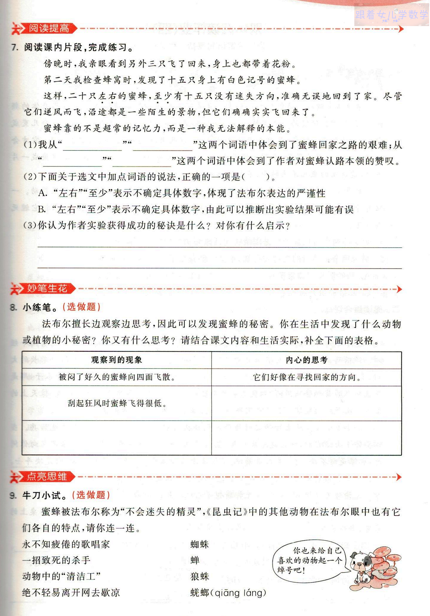 8.本题考查观察和思考的能力。结合课文内容可知,法布尔推测刮起狂风时蜜蜂飞得很低大概是为了“减少阻力”。填写最后一行时,我们可以仔细观察身边的动物或植物,写出自己的观察和思考。