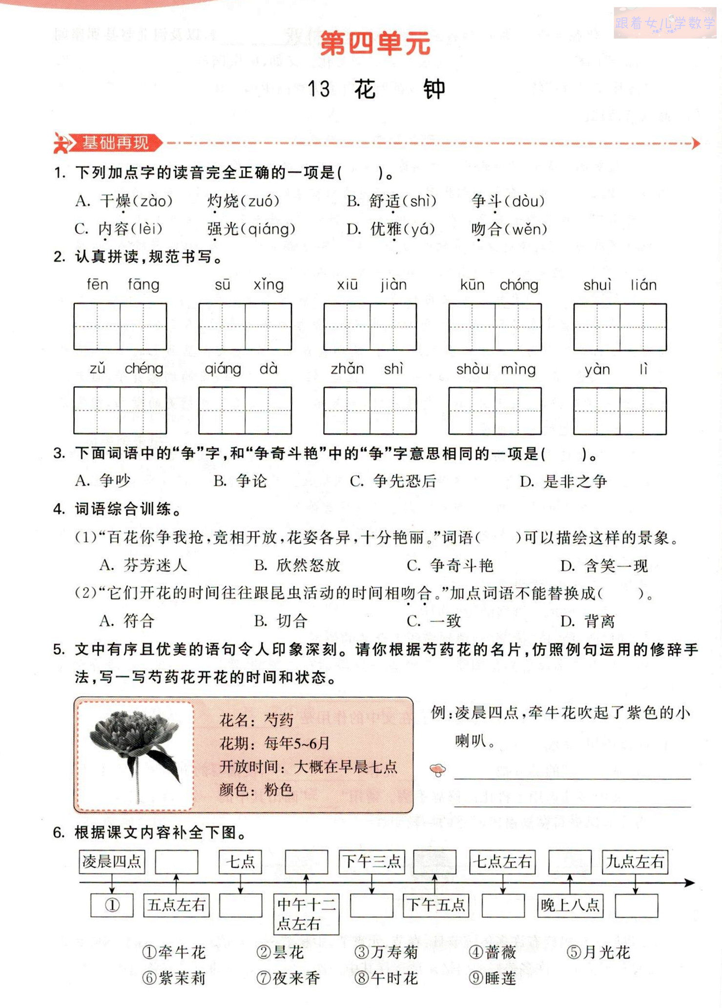 6. 本题考查课文理解。根据课文第一自然段中不同花朵的开放时间,补全花钟即可。