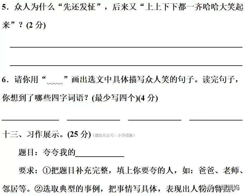 十三、(公众号:小学语数)思路点拨:要选择自己熟悉的人、熟悉的事来写,这样才能写得清楚,写得具体,写出真实的情感来。首先,我们要弄清人物身上的闪光点是什么。然后,选择能表现出人物的闪光点的事。同时,注意把文章的“六要素”交代清楚,做到条理清楚,描写具体。另外,在事件中这个人是怎么说的,怎么做的,一定要进行具体的描写,表现出人物的闪光点,突出文章的中心。 例文略。