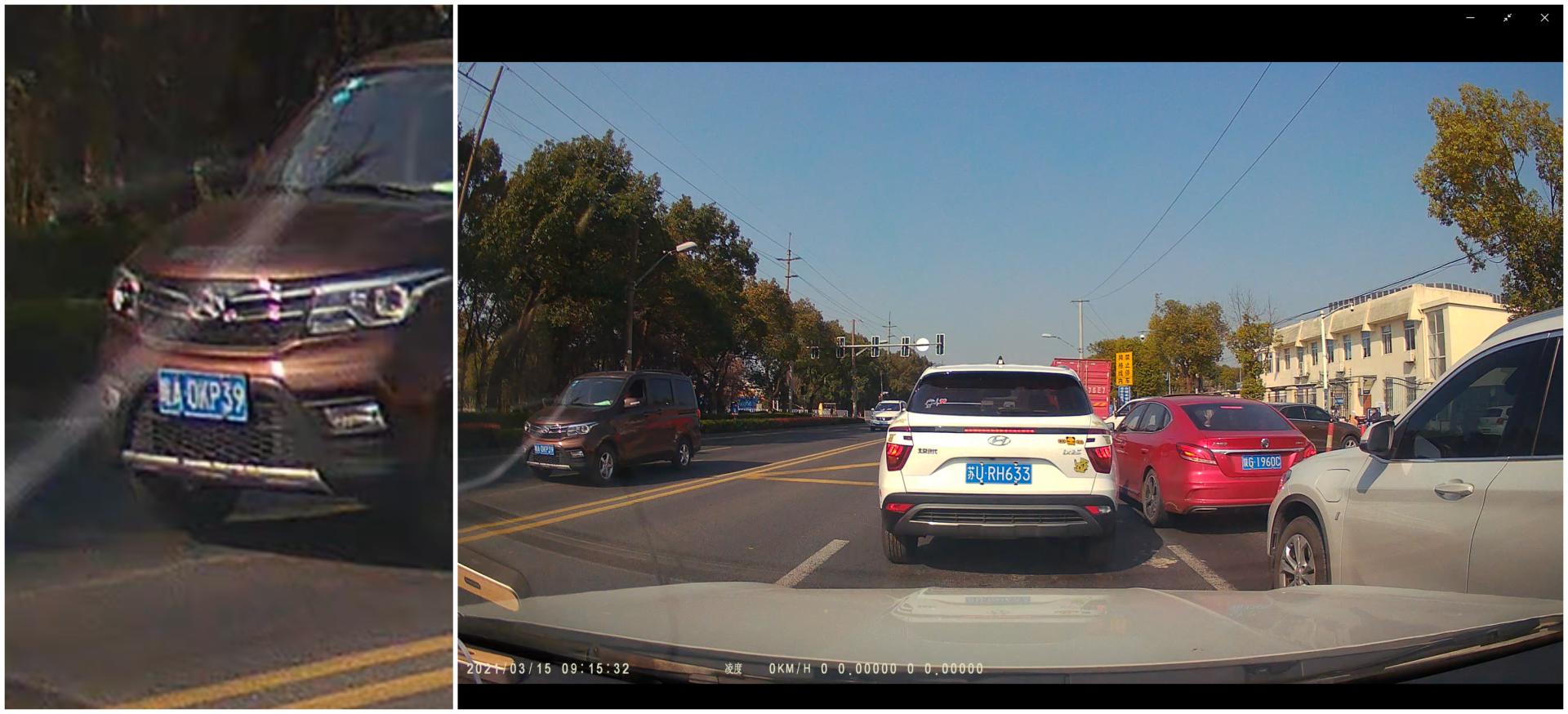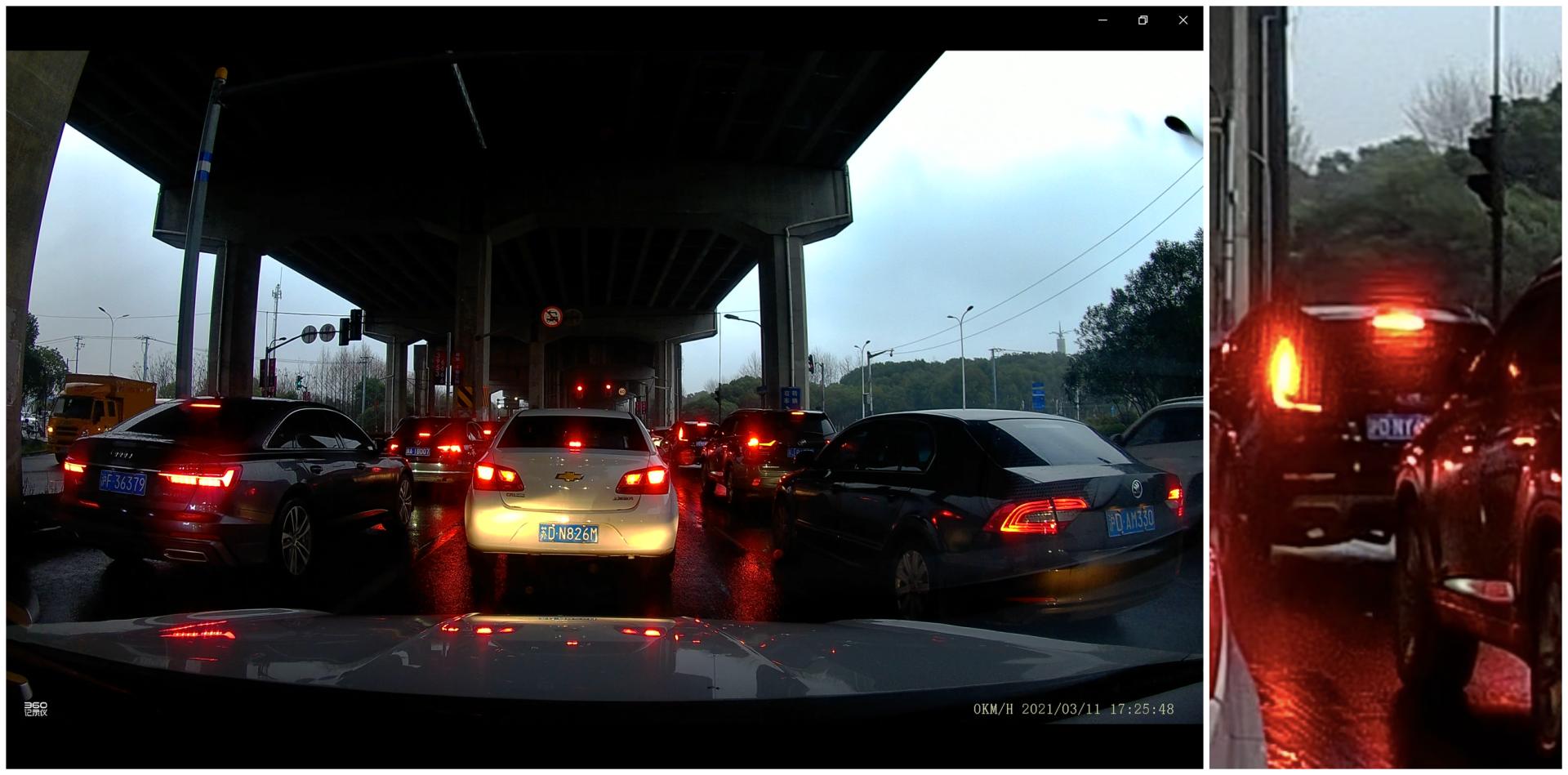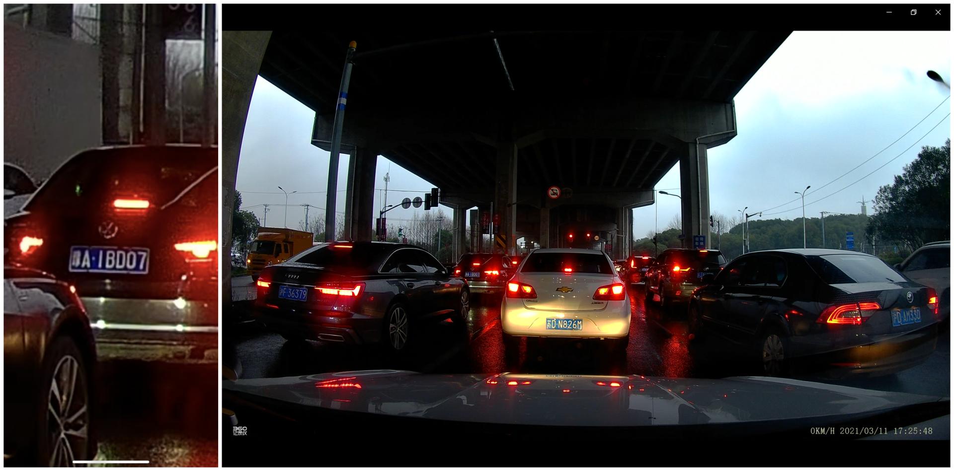 再来更极端一点的情况,间隔两条车道的对向来车,车牌仍然录制清晰。4K分辨率确实相比之前的1080P以及2K的行车记录仪有着明显优势。