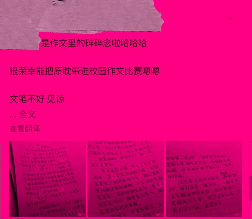 整篇的作文没能找到几篇,但是挂着原耽和耽美名头的素材收集倒是不少,在原耽女孩 这样的超话下面,不时就会看见分享自己夹带私货心得和因为原耽作文和老师/同学“对上了暗号”而兴奋不已的学生们。