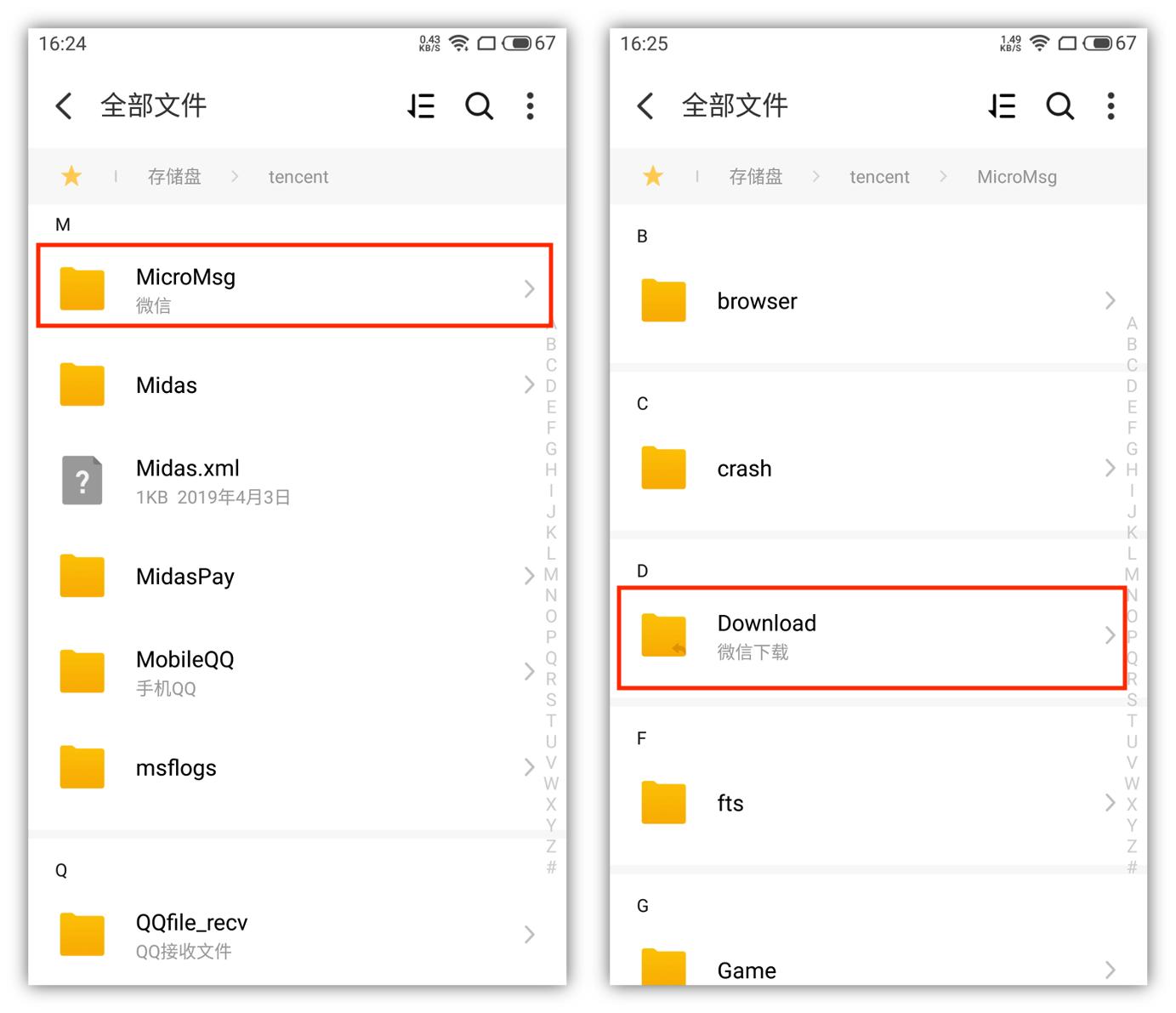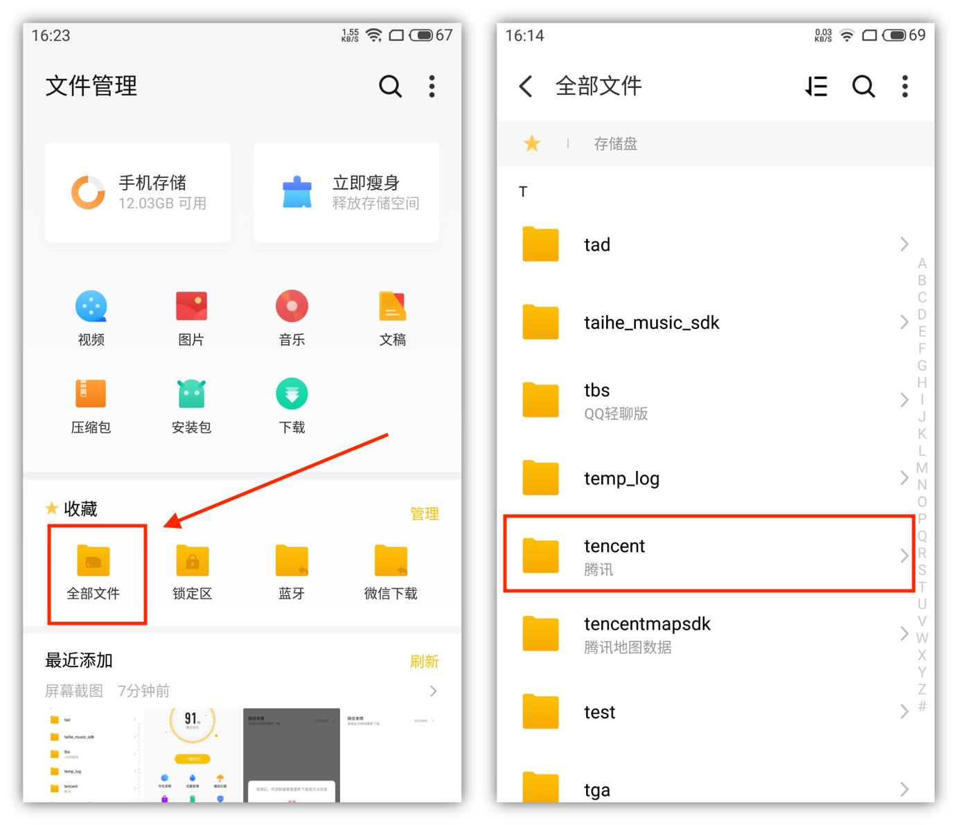 打开手机上的文件管理,然后点击[全部文件],虽然这些文件夹全是英文,但我们只需要找到T开头的[tencent]文件夹。