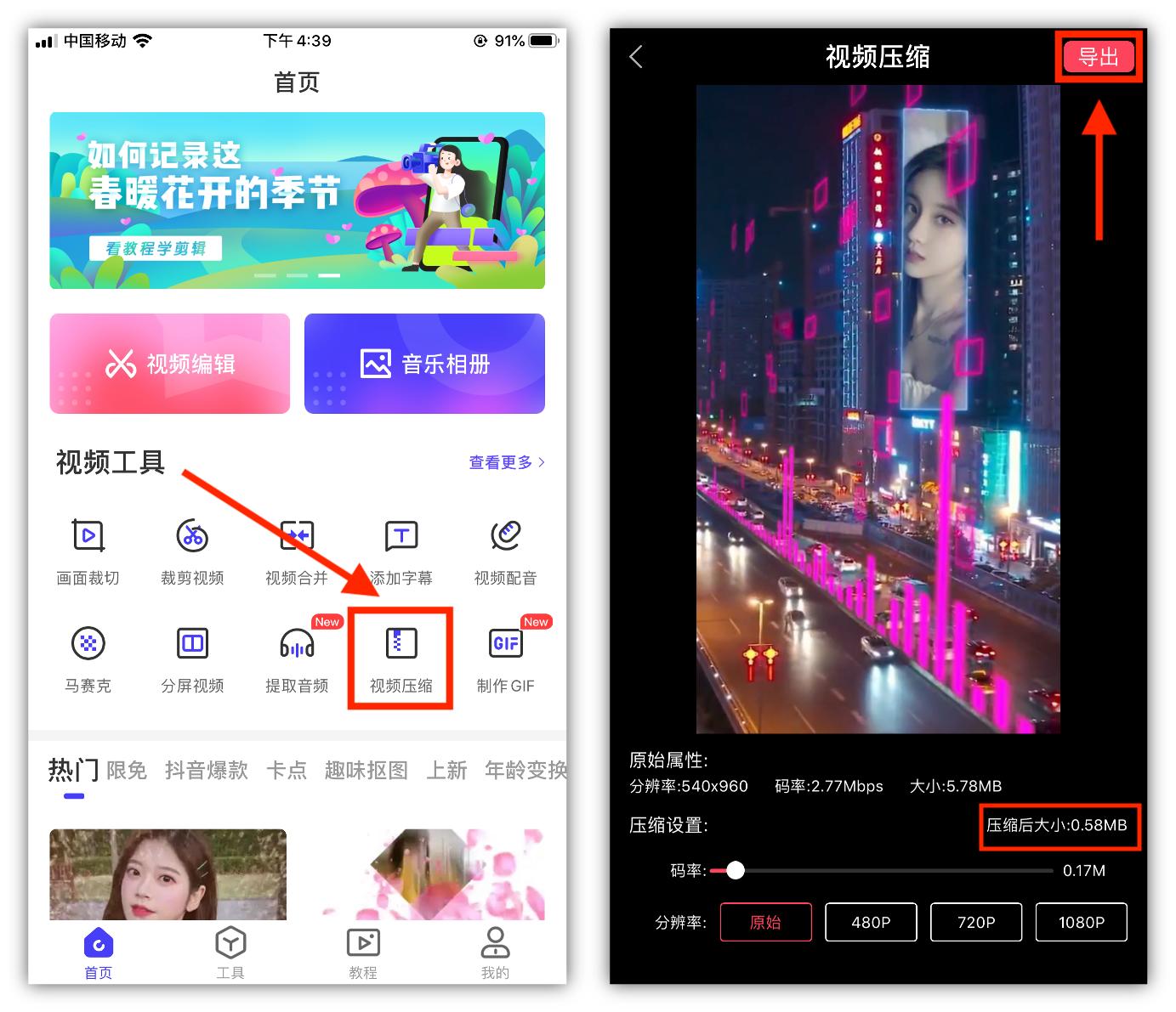 对于一些不想清理的视频,我一般都是用清爽视频编辑将视频压缩。在首页的视频工具下方,就能看到[视频压缩]功能,只需要添加视频,然后设置码率和分辨率,再导出即可。