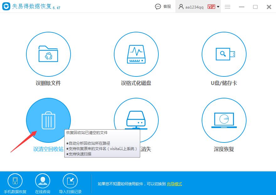 第一、运行失易得数据恢复,进入主界面后,选择“误清空回收站”功能。