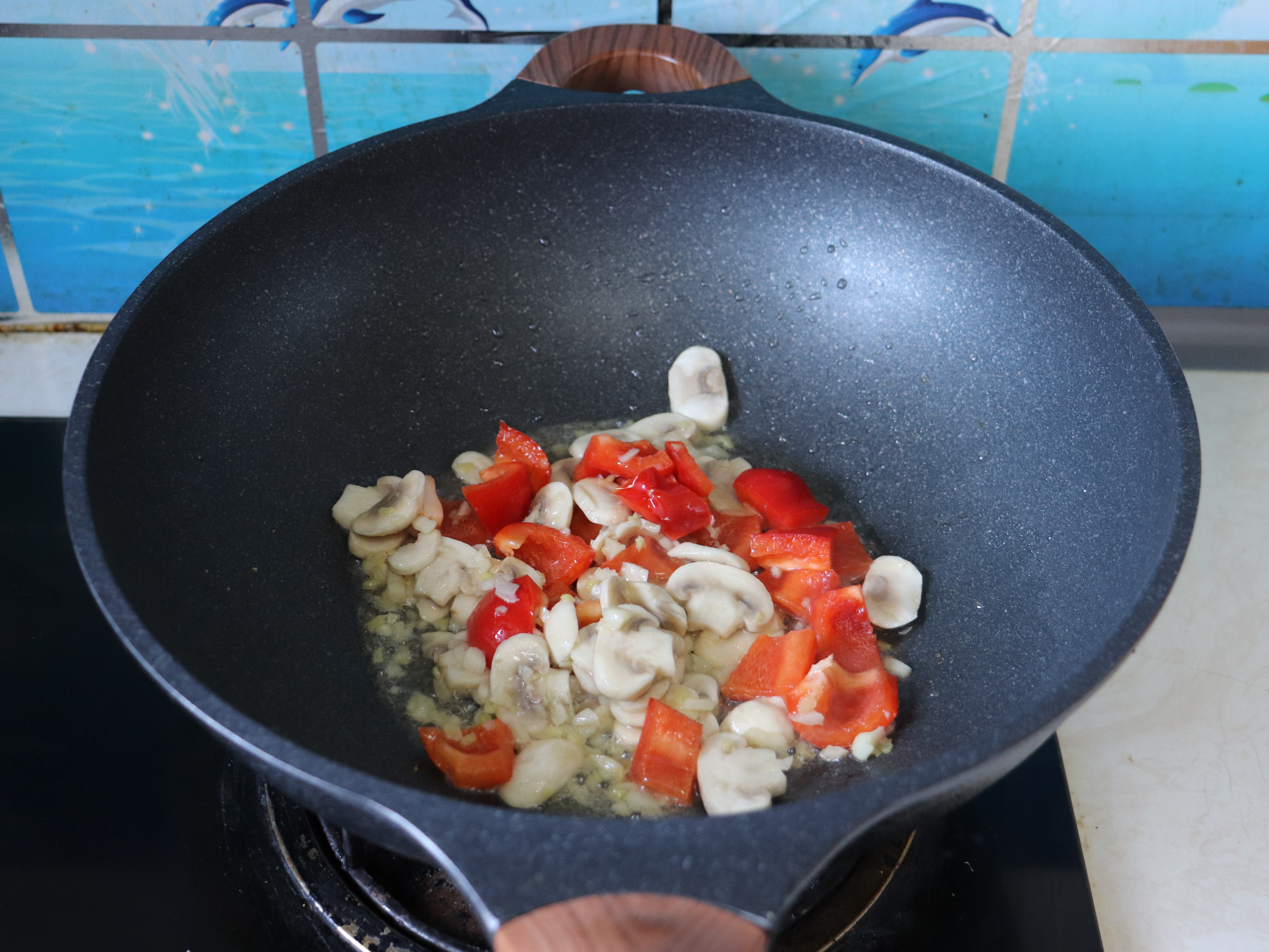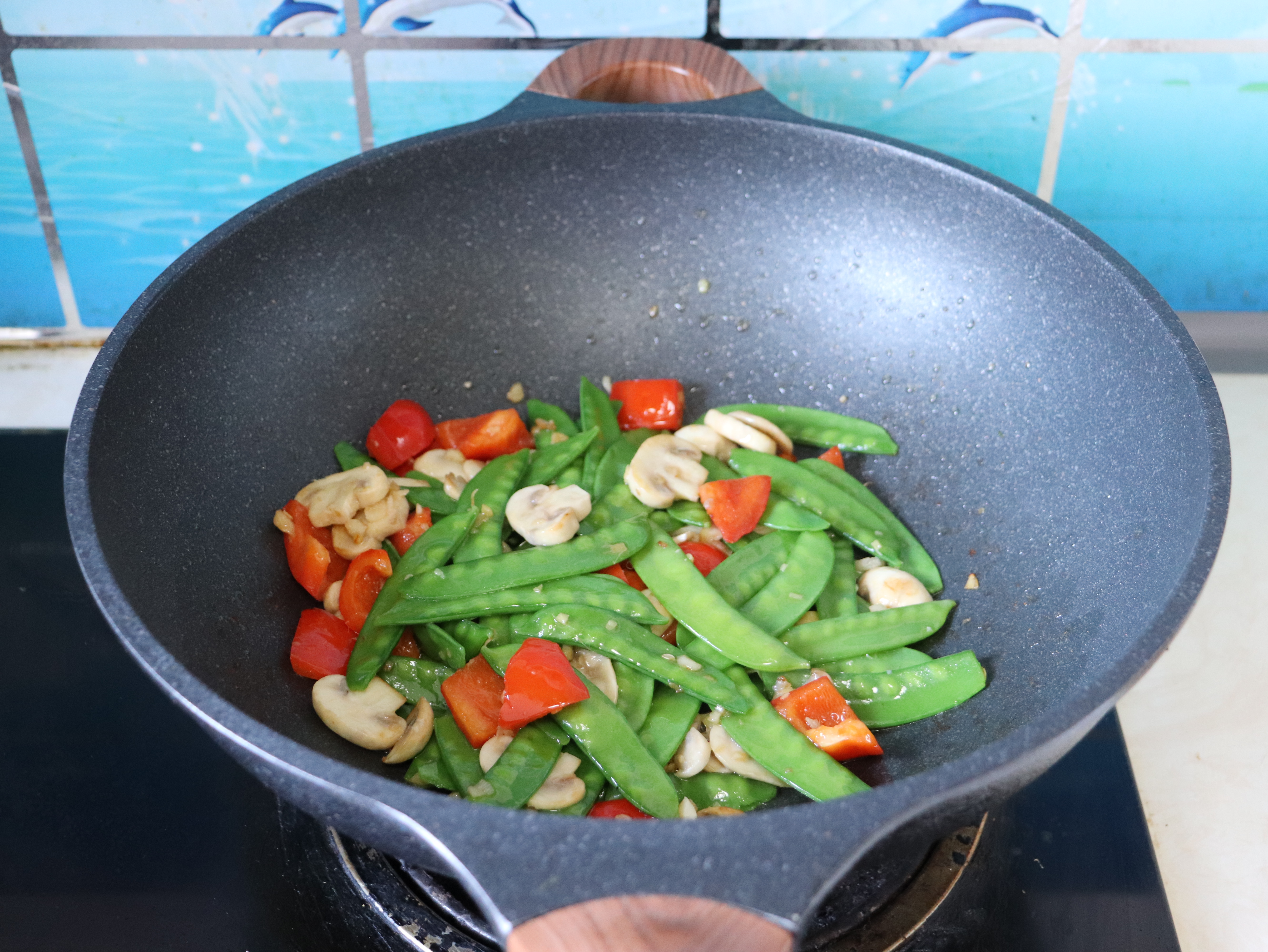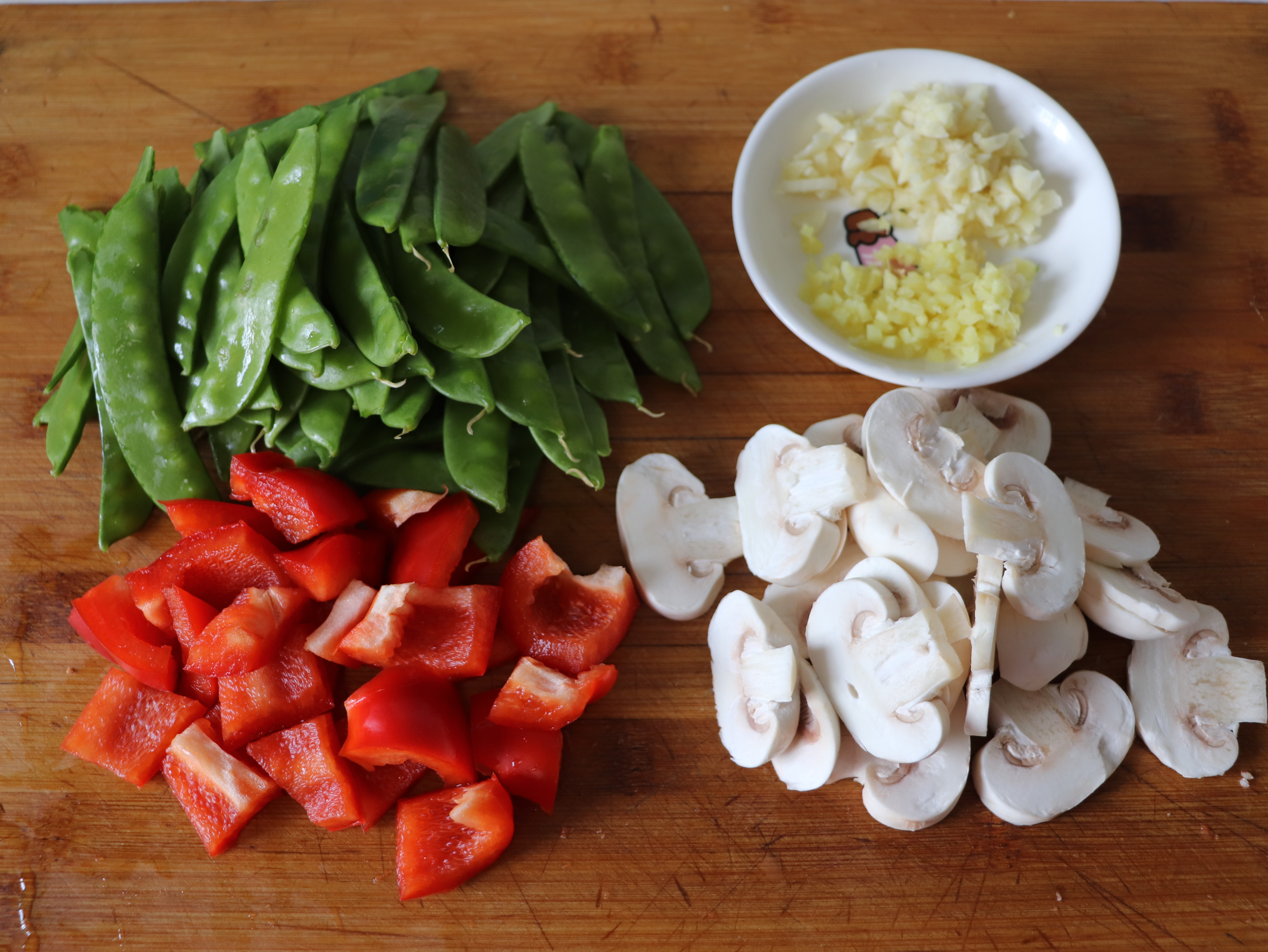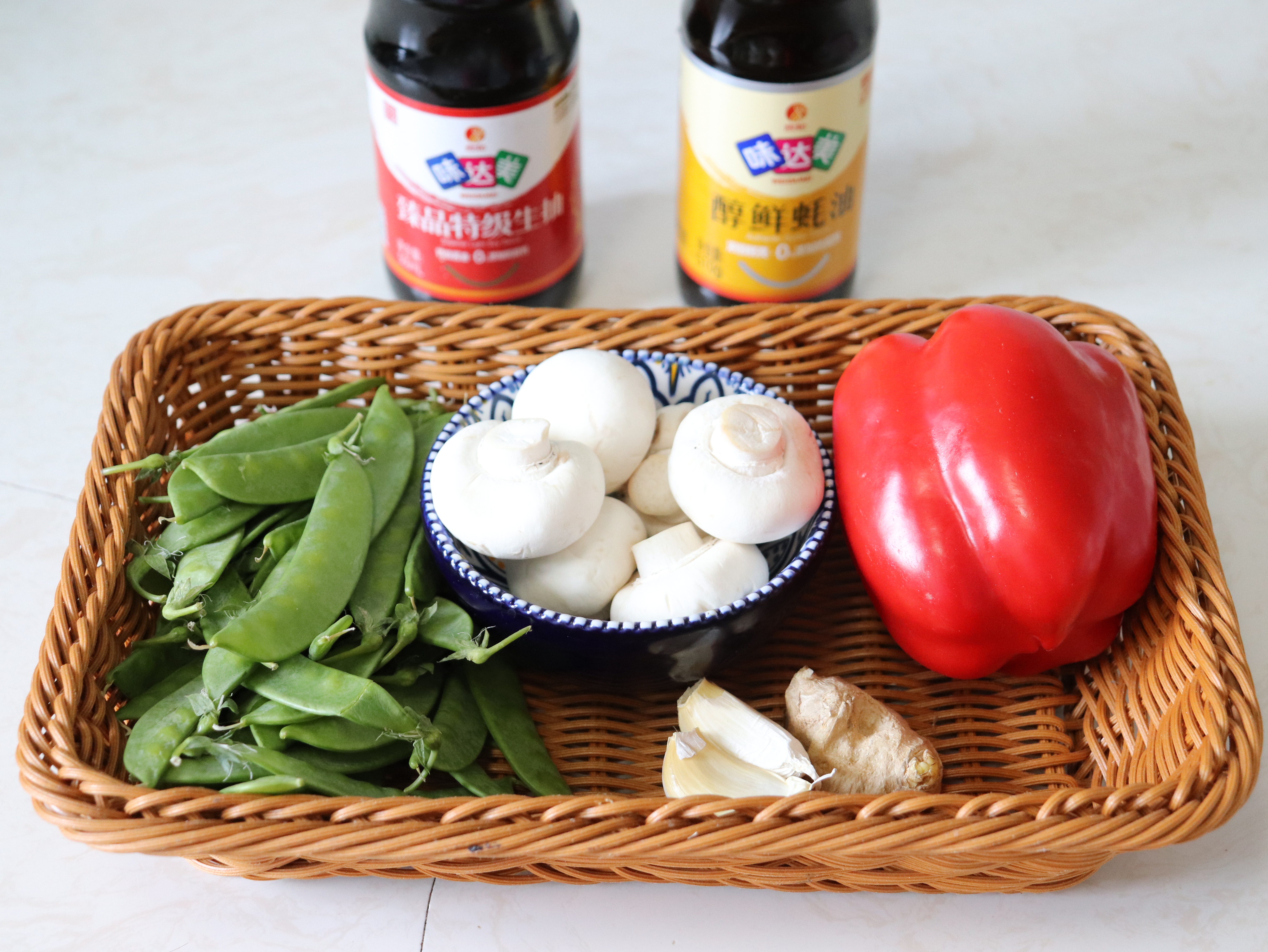 准备好所需要的食材并清洗干净,荷兰豆撕掉豆筋,姜蒜切末,口蘑切片,红椒切小块备用