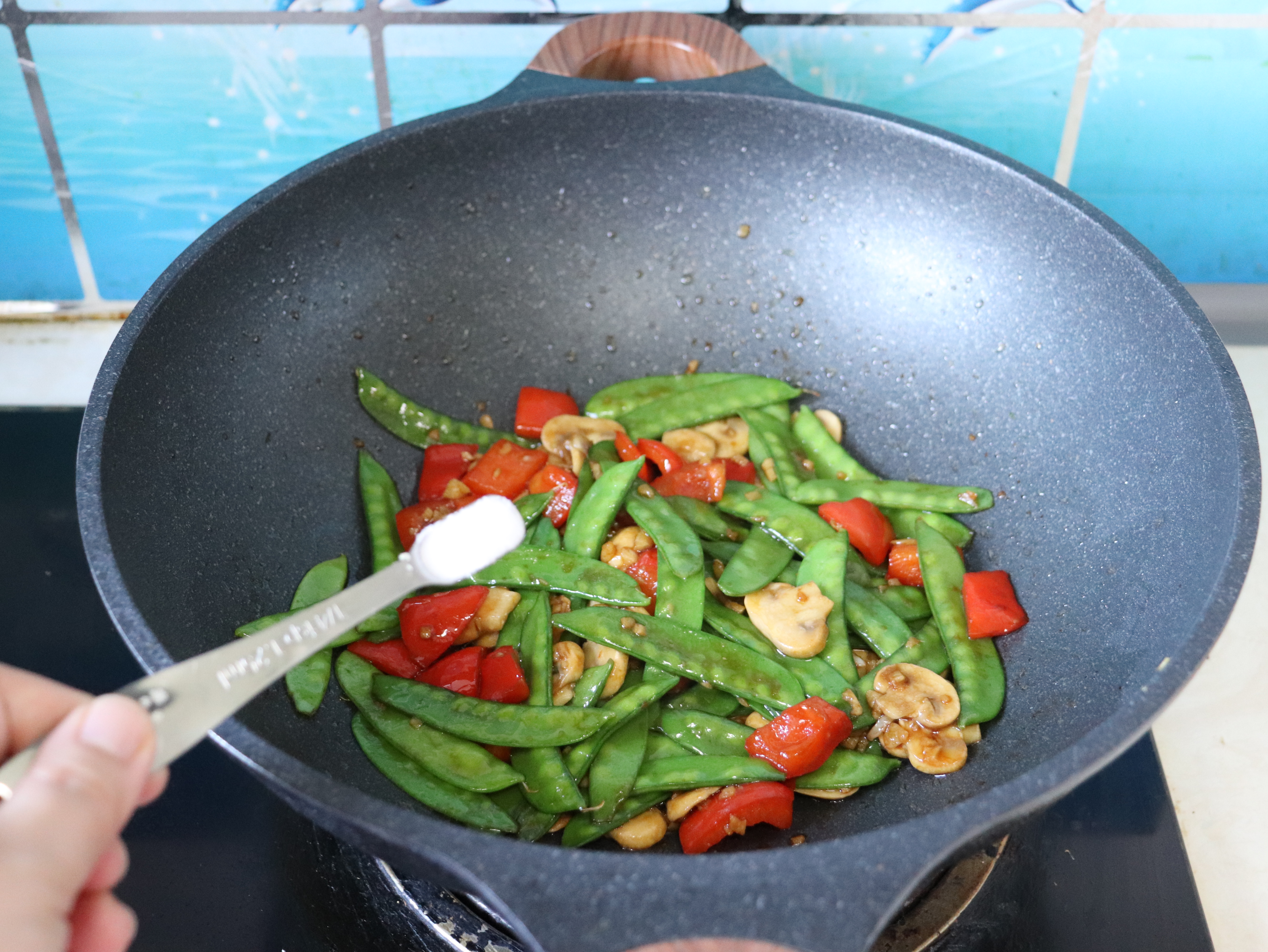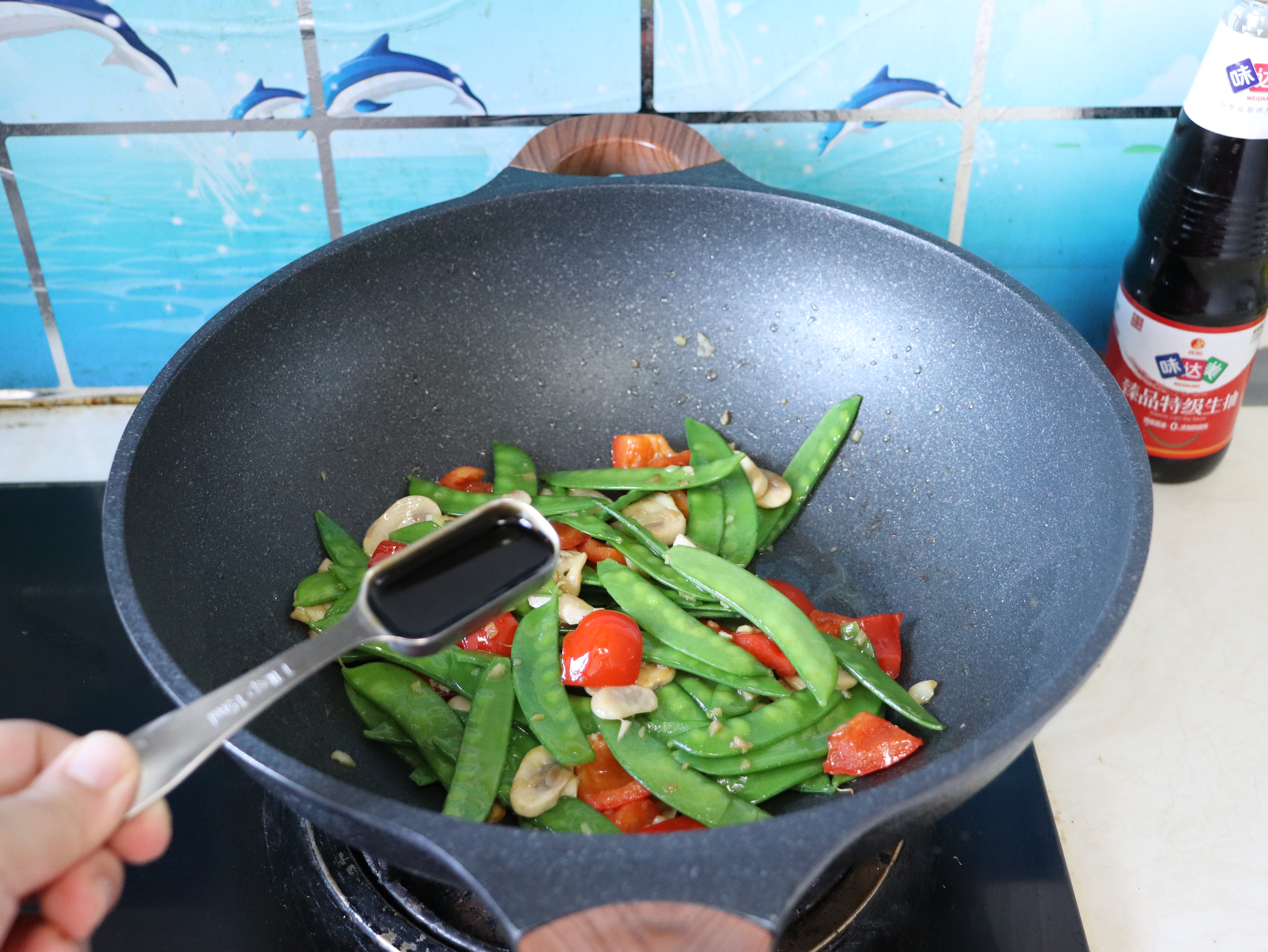 荷兰豆:150克,红椒:半个,口蘑:100克