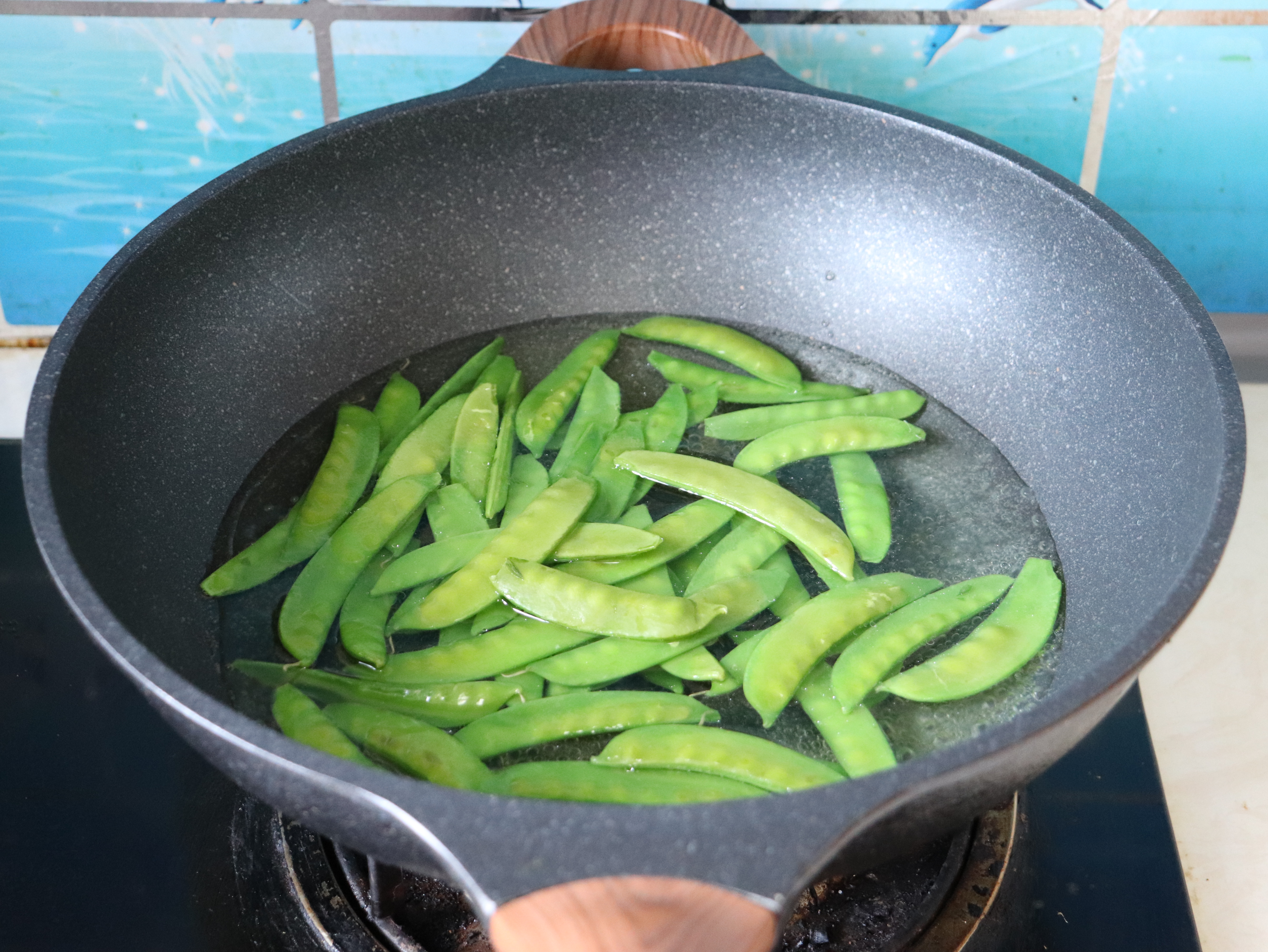 锅中适量水烧烤,放入少许盐和食用油,放入荷兰豆焯水1-2分钟,捞出控干
