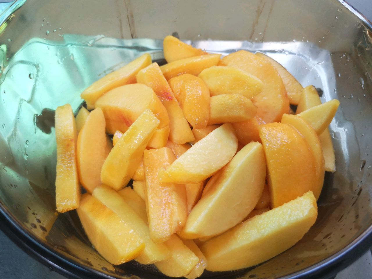 2、然后就是准备原材料黄桃了,现在可能还不是桃子的季节,所以我们直接在超市里面买现成的黄桃块就可以了,切成小块,清洗干净之后就可以了。