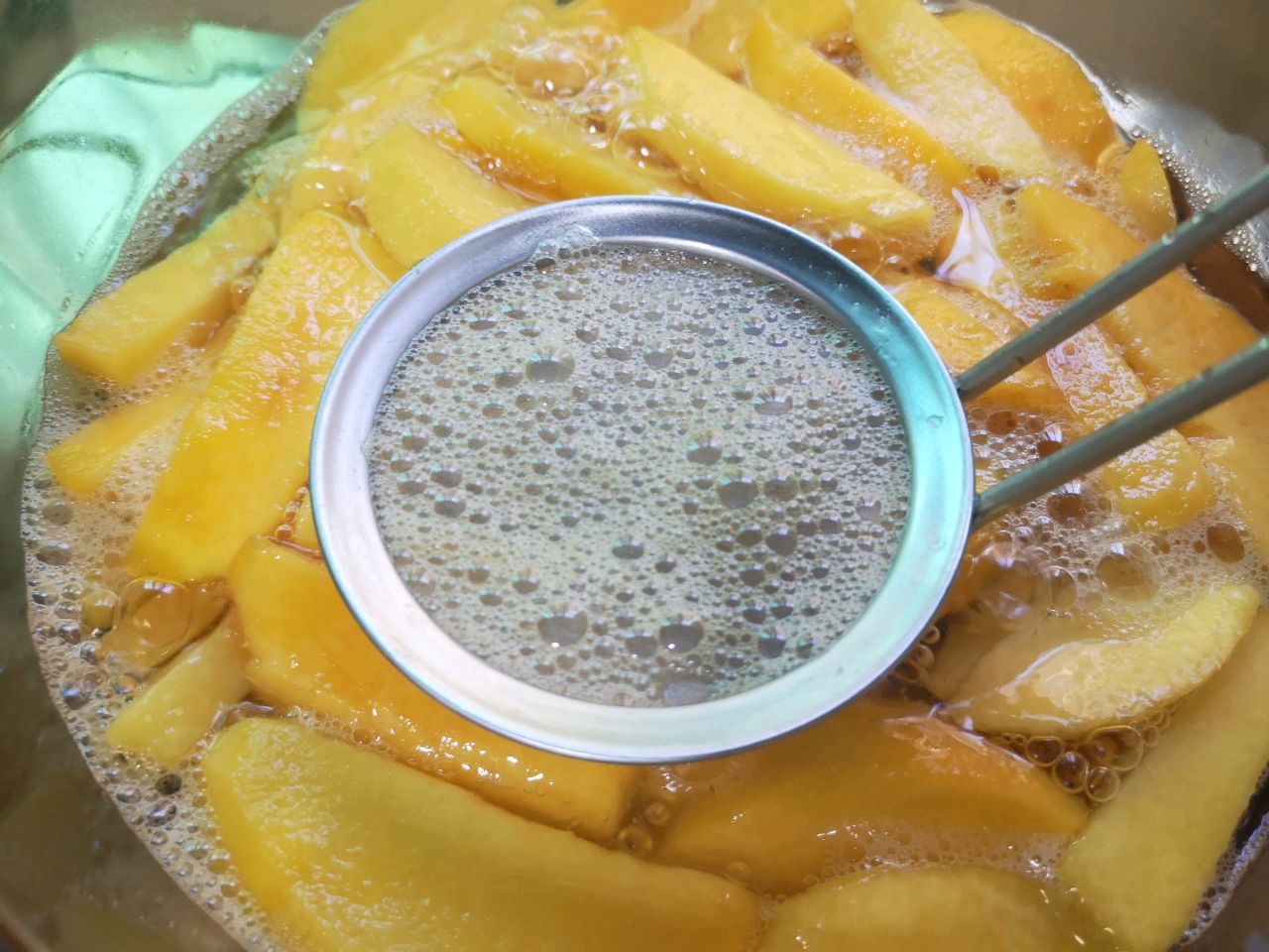 3、黄桃和水一起加入锅中,再加入适量的水,大火煮开,期间用滤网去除表面的浮沫。