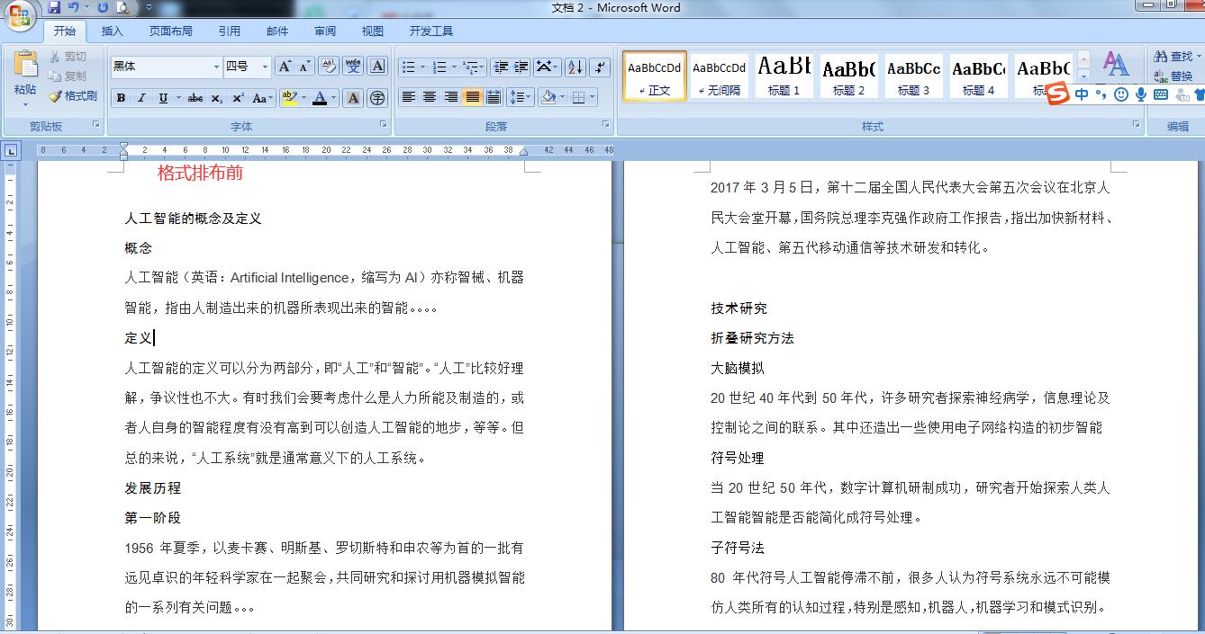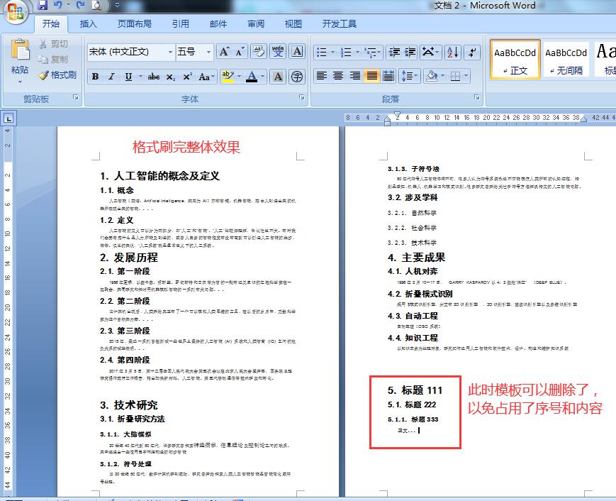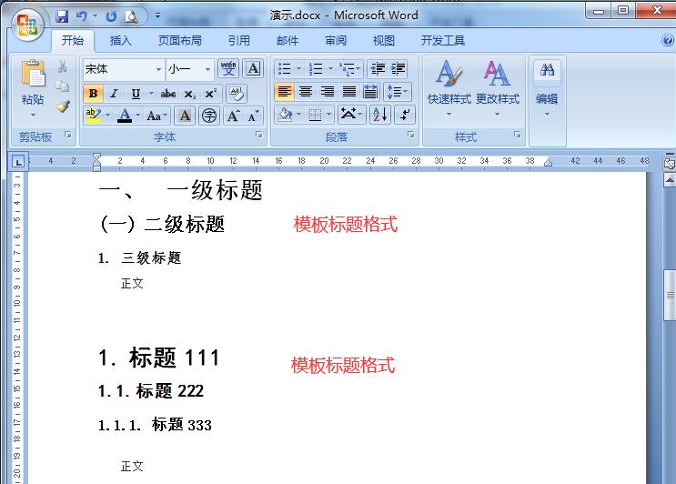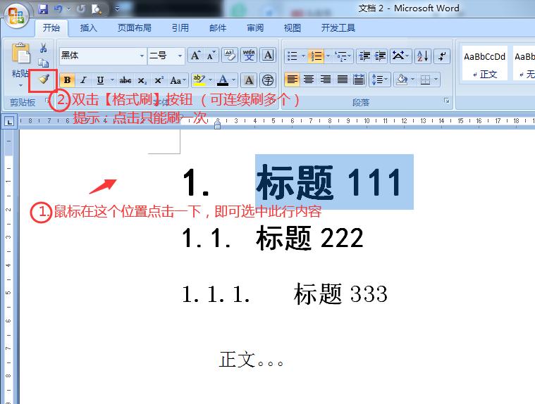 4.按照步骤3的方法,把材料中所有1级、2级、3级标题,用对应模板‘标题111’、‘标题222’、‘标题333’分别刷一遍 (注意,退出或切换格式刷要在键盘上按【ESC】,或鼠标点击一下【格式刷】按钮)