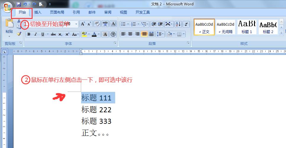 2.在顶部菜单栏切换至【开始】,然后在左侧点击图中位置点击一下选中第一行(或者直接鼠标拉选)