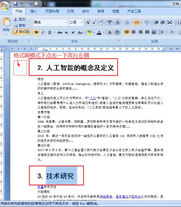 3.在我们的Word材料中,找到属于1级标题的内容,用格式刷刷一下(即在该行左侧空白区域点击一下),然后此行内容就设置成1级标题了,格式与模板完全一致,序号也是自动编排的