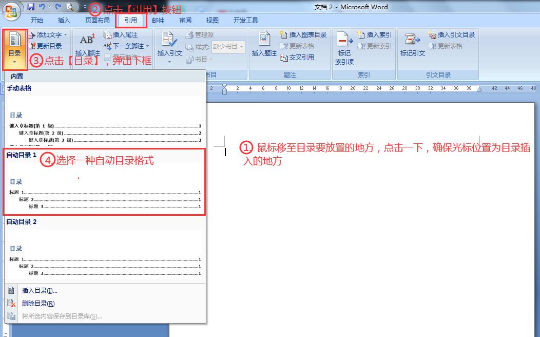 1.鼠标移至在文章的要放目录的位置,一般在封面后面→点击菜单栏【引用】→点击【目录】→选择一种自动目录的方式,比如“自动目录1”