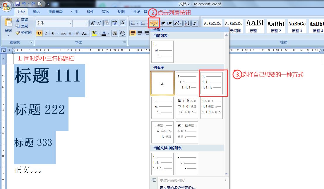 5.同时选中三个标题→点击【多级列表】按钮→选中其中一种样式,效果如下: