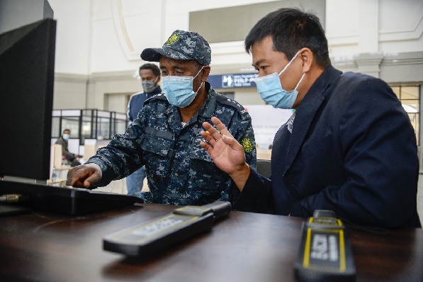 3月6日,在埃塞俄比亚亚的斯亚贝巴,一名警员(前左)操作中国捐赠的安检设备。