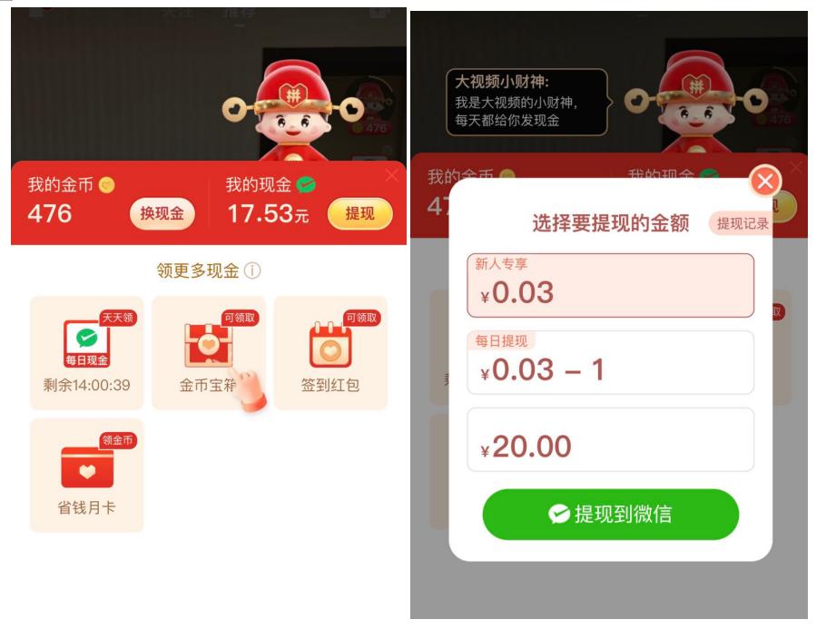 在这种产品设计下,用户就可能为获取定时金币选择多停留刷几个视频。另外,平台仅支持用户在次日提现当日积累的提现金,这意味着,用户若想成功提现,第二天就必须再使用大视频产品。
