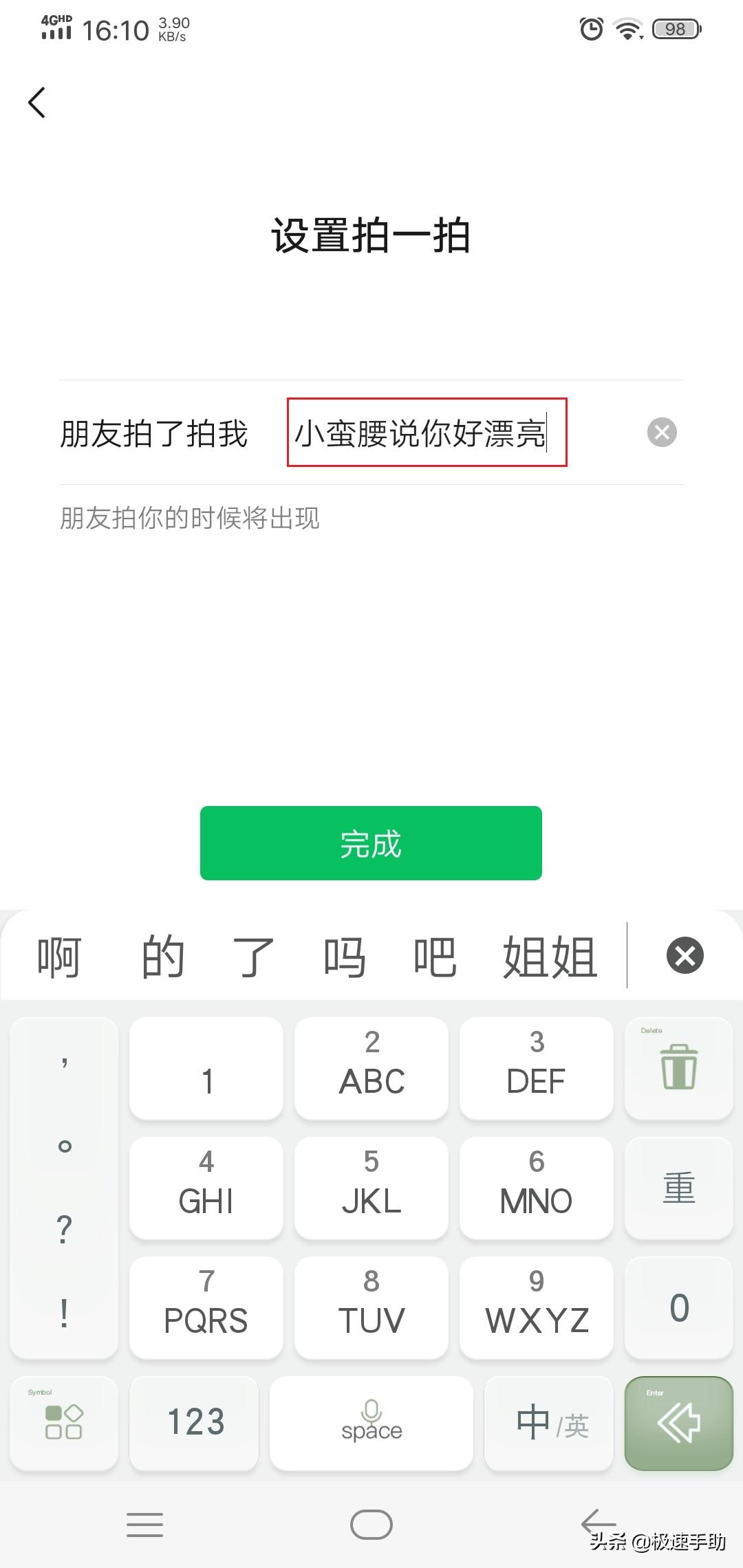 第七步,然后我们就可以设置我们拍一拍后面的文字内容了,根据自己的实际需要来进行设置即可,文字设置完成后,点击【完成】按钮。