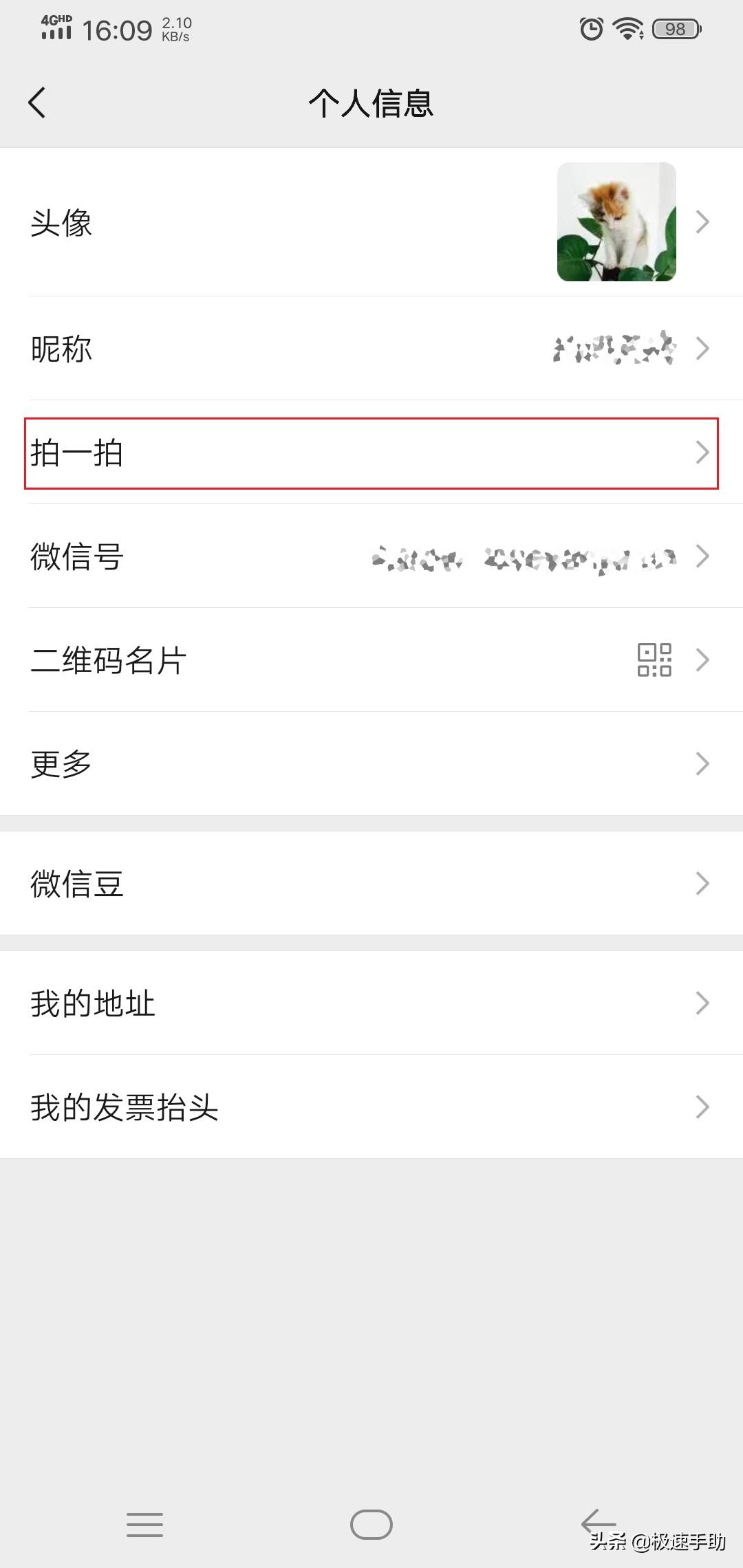 第六步,接着我们就进入到微信的个人信息界面了,在此界面中,我们找到【拍一拍】功能,并点击进入。
