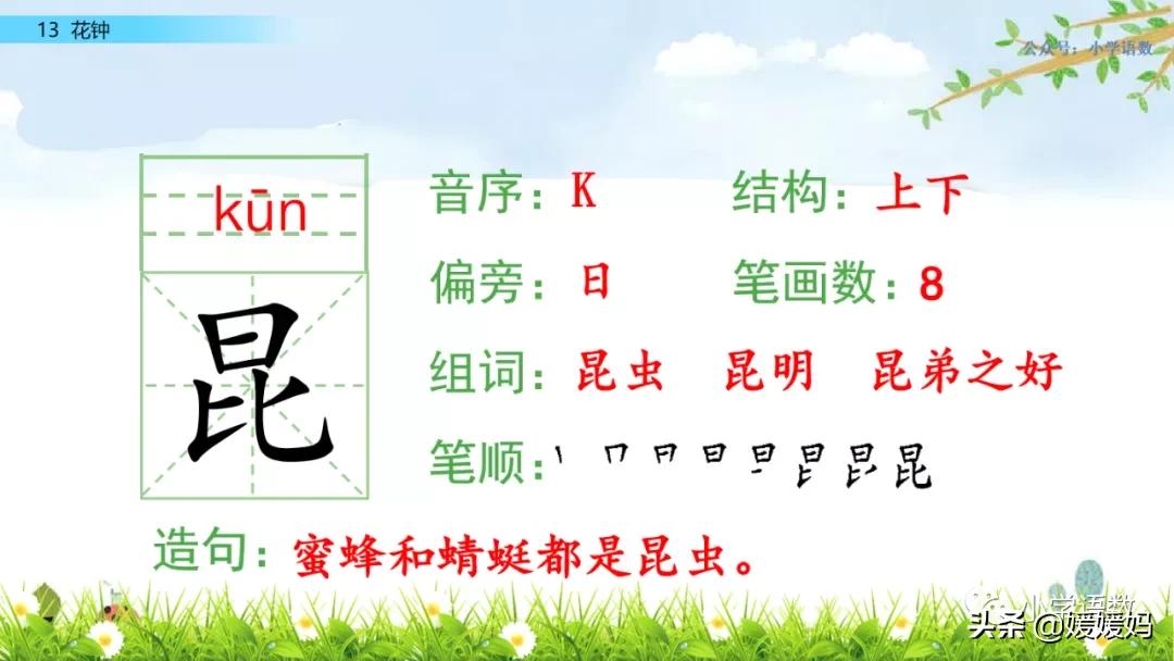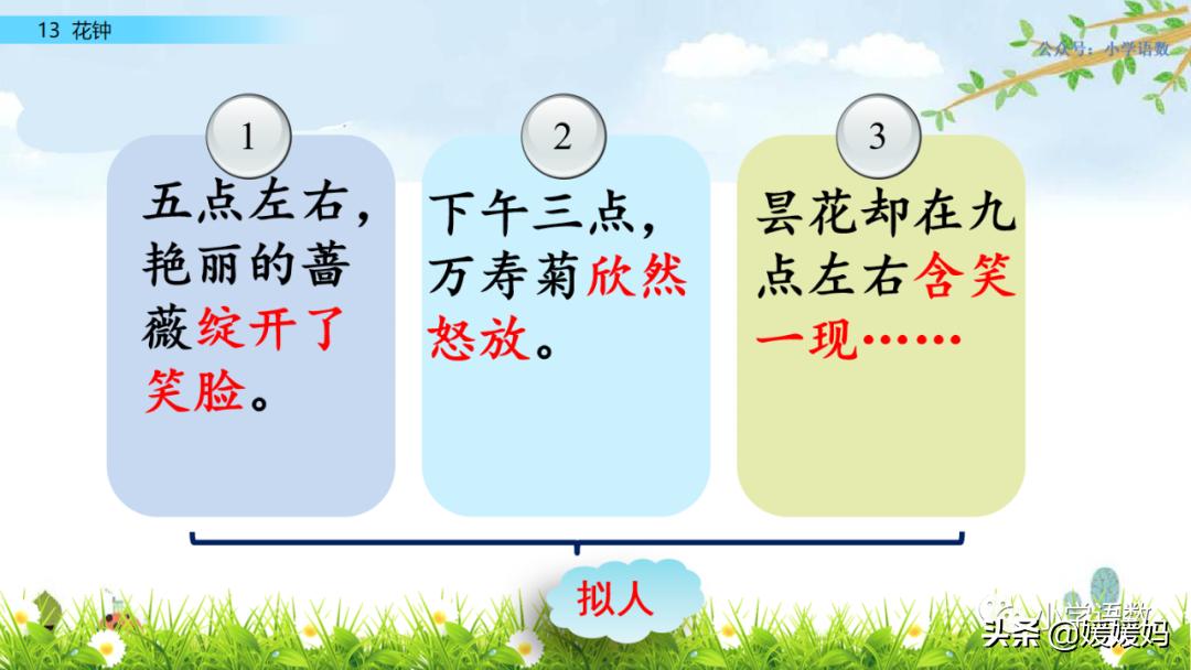 按照时间的先后顺序列举了九种花开放的时间,充分说明了作者的发现——不同的花开放的时间是不同的。作者运用拟人的修辞方法,生动形象地写出了各种花开放时的动态画面,多样的句式使课文显得生动有趣,不单调。省略号省略的内容是生活中还有很多很多的花在不同的时间开放。