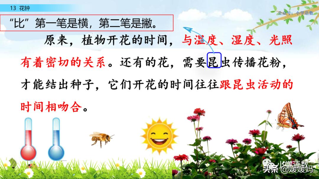 原来,植物开花的时间,与温度、湿度、光照有着密切的关系。还有的花,需要昆虫传播花粉,才能结出种子,它们开花的时间往往跟昆虫活动的时间相吻合。