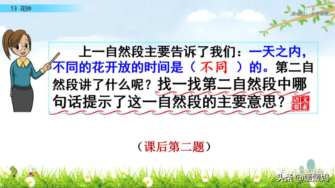 第1自然段:一天内,不同的花开放的时间是不同的;