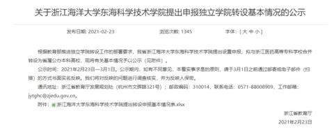 2月23日,省教育厅官方网站公示了“关于浙江海洋大学东海科学技术学院提出申报独立学院转设基本情况的公示”。