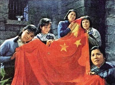 “好吧。”江姐双手接过红旗,迎风一抖,五颗晶亮的金星,立刻随着红旗飞舞。江姐高高地亮开红旗,无畏的声音里充满着幸福的感情:“让五星红旗插遍祖国每一寸土地,也插进我们这座牢房。”
