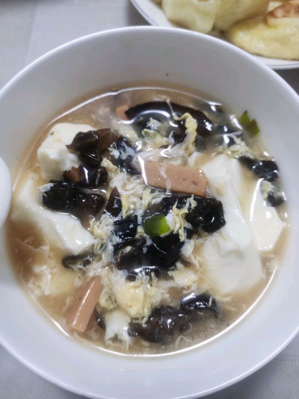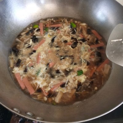 6、水开后,把鸡蛋液撒进锅中,再次开锅调入水淀粉,待汤羹浓稠可以关火,可以适量调入一些鸡精,不喜欢可以不放(我不怎么喜欢调味品,所以没放)