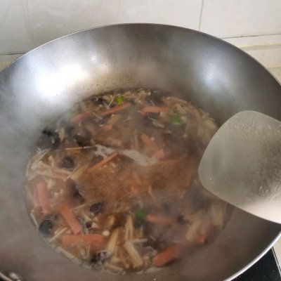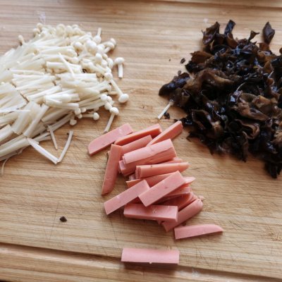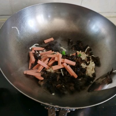 4、锅中放少许油,中小火,油热放葱花炒香,然后放木耳、金针菇和火腿肠翻炒,加入生抽、耗油,继续翻炒几下,炒香