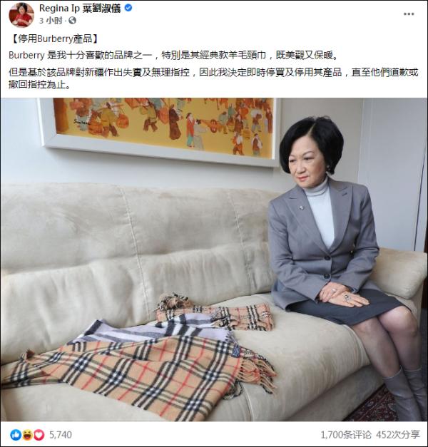 (观察者网讯)近日,瑞典时装公司H&M一份“停止使用新疆棉花”声明引发中国网友愤怒,后续耐克,阿迪达斯、巴宝莉等多个品牌也牵涉其中。香港立法会议员、香港新民党主席叶刘淑仪3月26日在脸书发文表示,自己已停用巴宝莉产品,直至他们道歉或撤回指控为止。