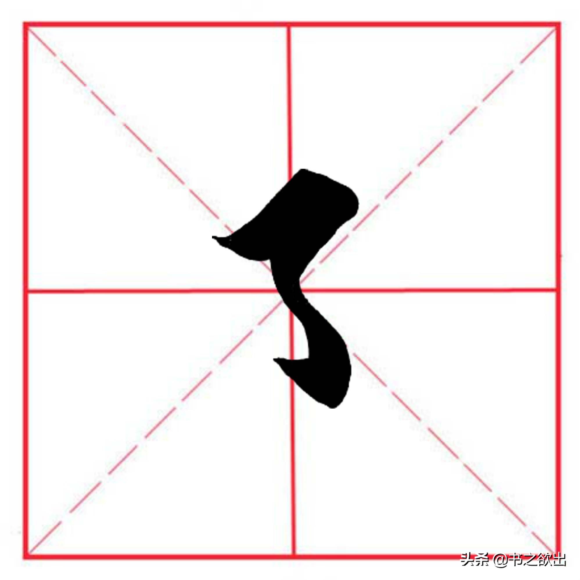 起笔露锋,不要写重,然后向右上大抗肩,不要写长,到转折处向上略提笔锋,利用笔尖写出“上角”,随即位于横画上向右下方顿笔,注意顿笔的角度,然后顺势转锋向左下方写“小撇”,行笔要轻,勿长,到位后笔锋不离纸面,连续向右下方行笔,稍带弧度,笔画渐重,到出钩处折锋向左上方挑笔出锋,出锋勿大。