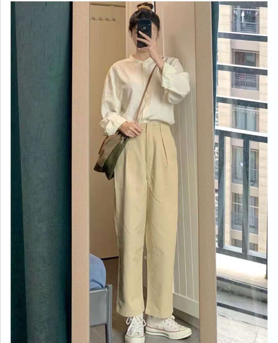 look1 米杏色圆领衬衫+浅卡其色九分直筒宽腿裤+白色匡威帆布鞋