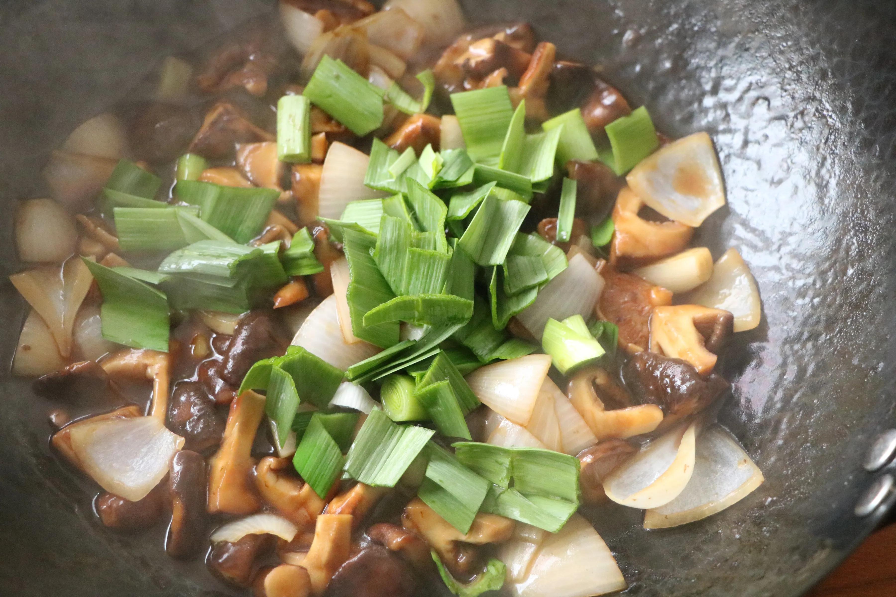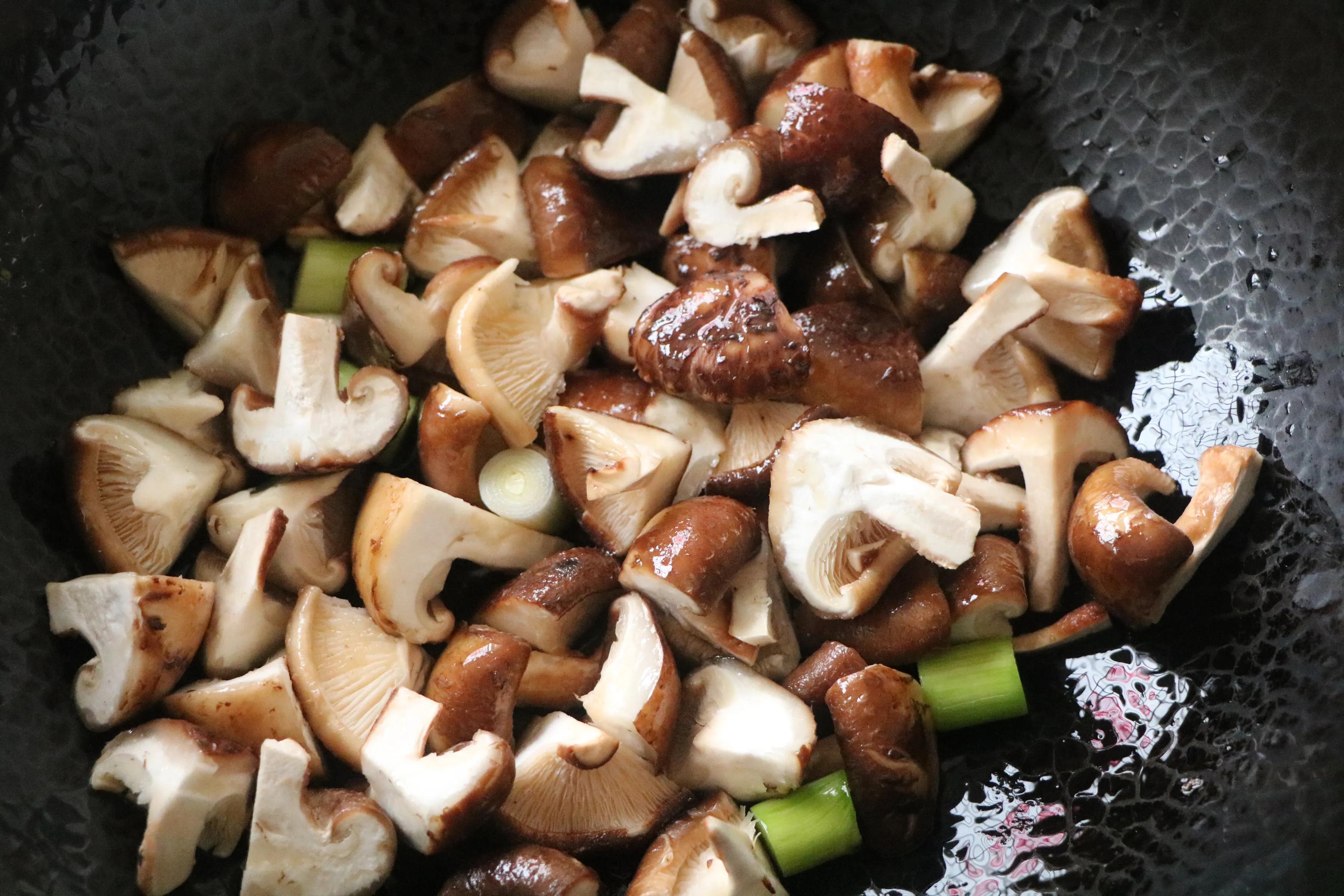 6、锅中热油,把蒜苗的根部加进去炒出香味,再把香菇也加进去翻炒至香菇变软;期间可以加些清水进去翻炒;