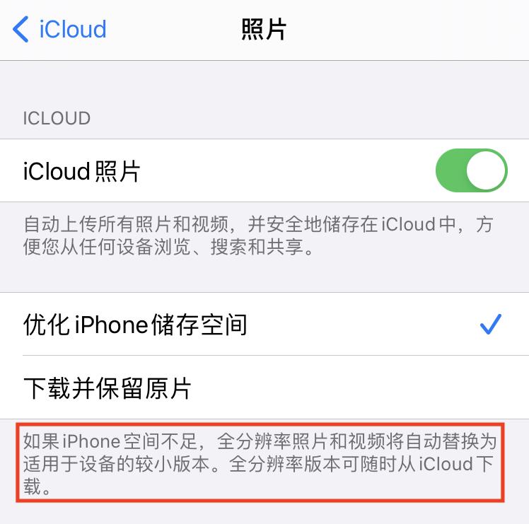 iCloud照片的另一个更重要功能就是可以优化你手机中照片、视频的大小。在手机存储空间不足时,勾选“优化照片”,可能将手机中的照片同步到iCloud中,仅保存较小尺寸的照片在本地,再需要使用时从iCloud中下载。
