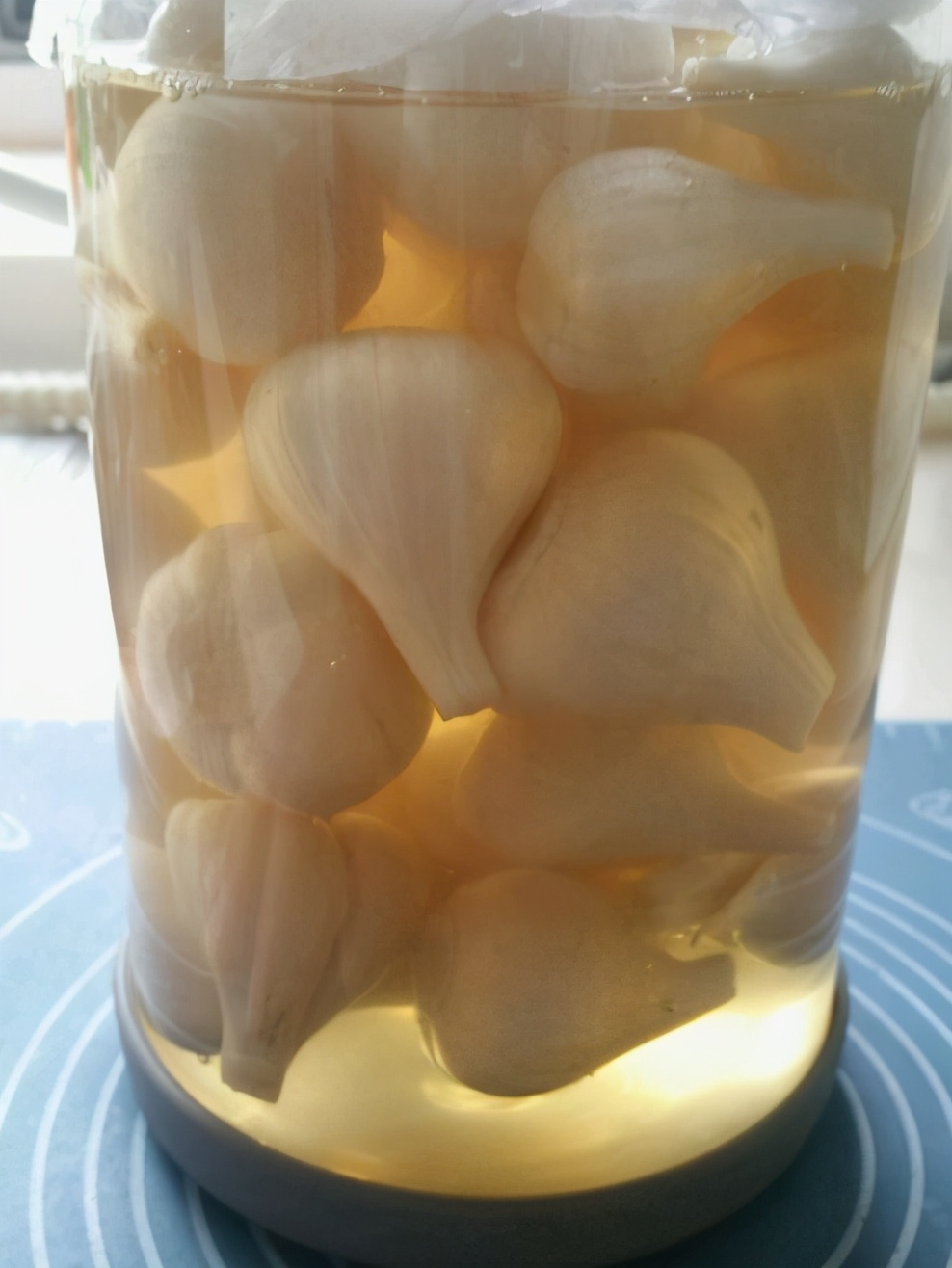 在腌制之前,先要用淡盐水把大蒜泡一泡,能去除蒜瓣的涩味、辣味,口感更好。然后要用食盐腌出大蒜中多余的水分,这样能更快地吸收料汁,口感才脆爽,也更加入味。最后加入适量高度白酒,能让增加香味,延长保质期,放一年都不会坏。