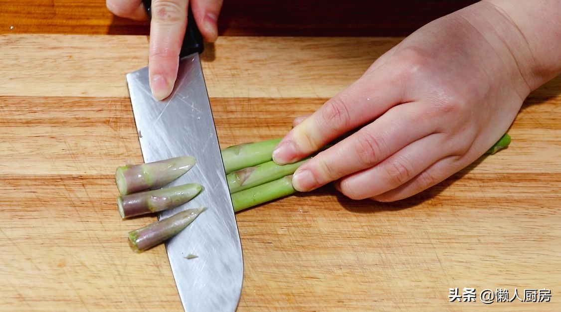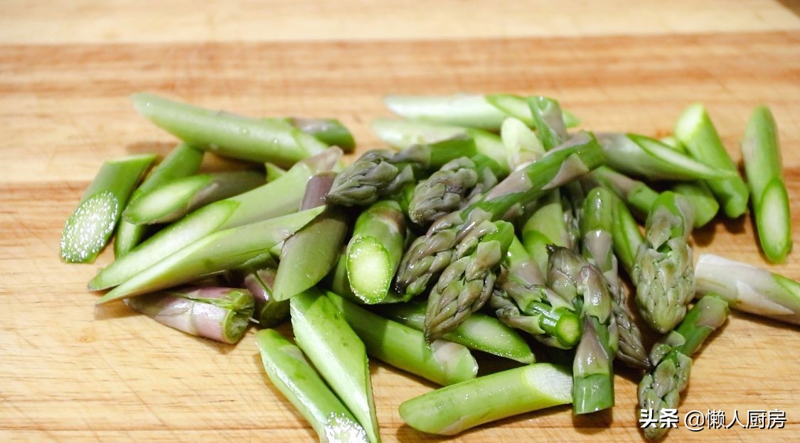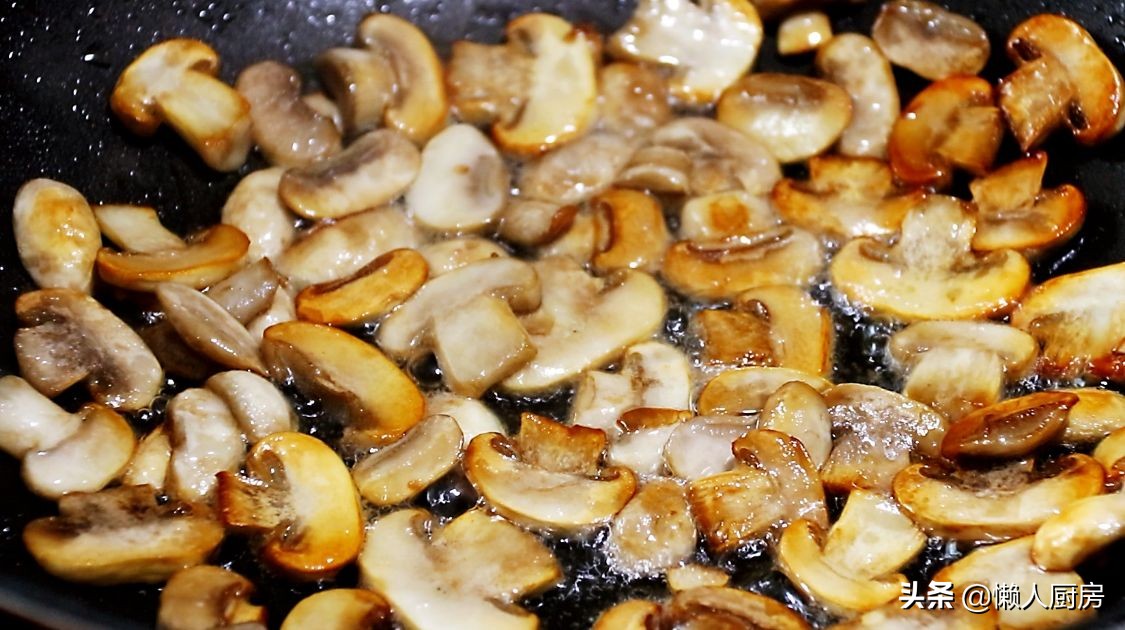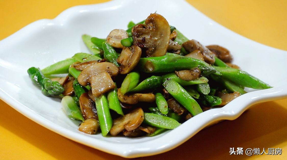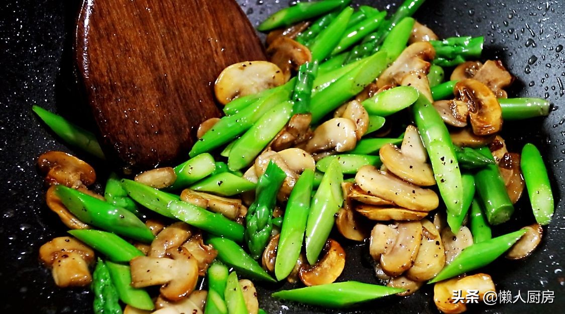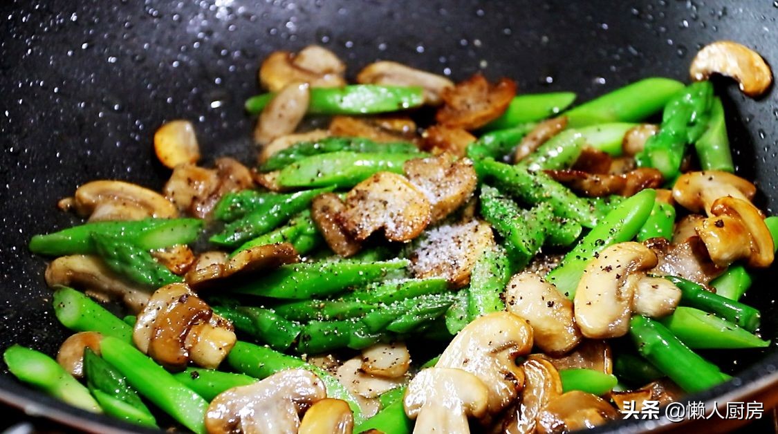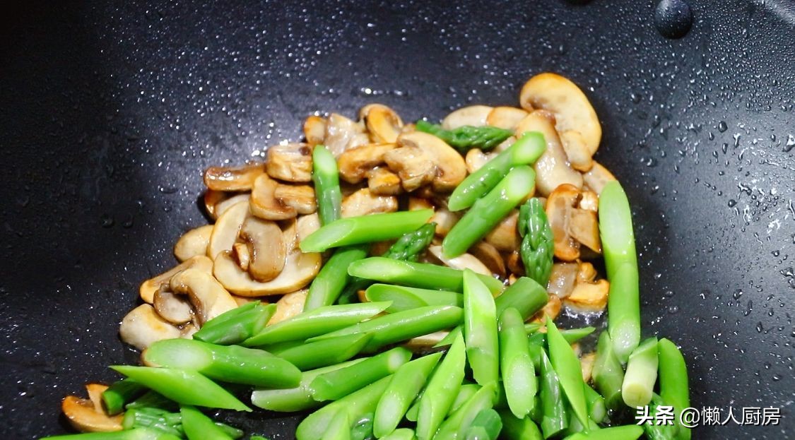 煎到口蘑两面金黄,倒入焯过水的芦笋翻炒均匀。