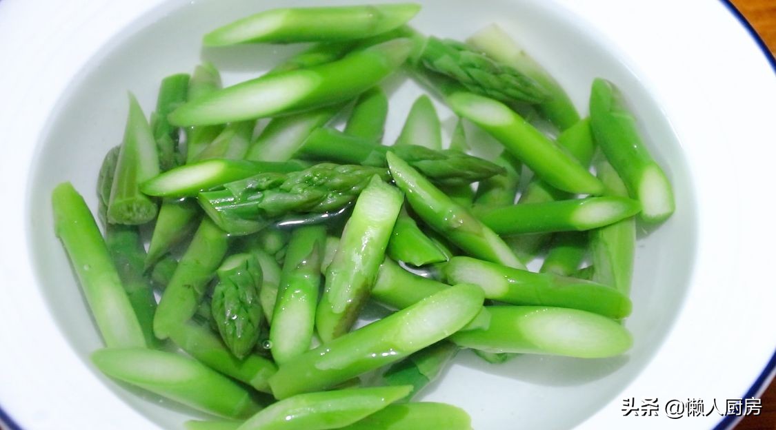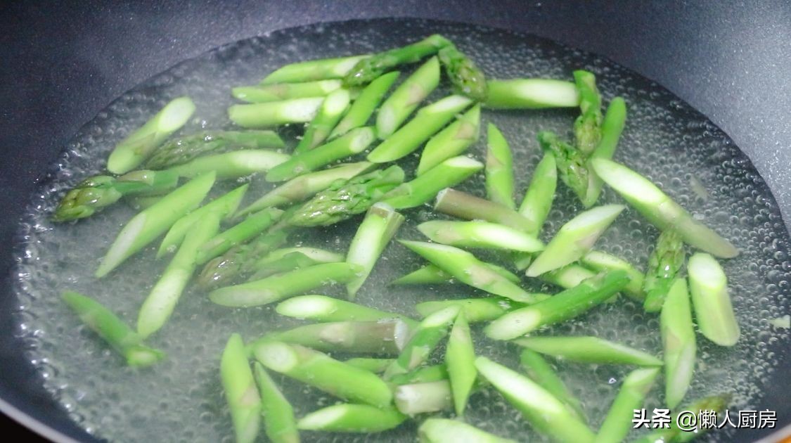 锅内倒水,水烧开后倒入芦笋,给芦笋焯个水,焯上10秒钟捞出,放入冷水中过凉。