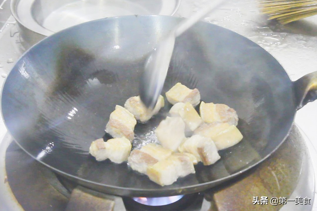 第三步:锅里倒入植物油,油烧热之后倒出,锅中再淋入一小勺冷油防止猪肉粘锅,倒入五花肉开中火煎制,五花肉慢慢变黄,猪皮起泡,肥肉发亮流油的时候就可以捞出锅了。