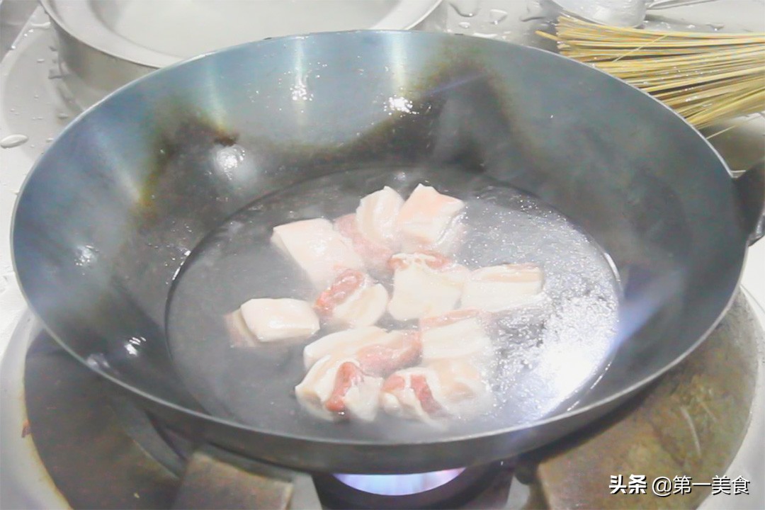 第二步:锅中加入水, 把准备好的五花肉冷水下锅,再倒入少许料酒去除猪肉的腥味,水煮沸腾之后打去上面漂浮的浮沫,再煮制大概1分钟捞出猪肉,捞出的猪肉用清水冲一下。