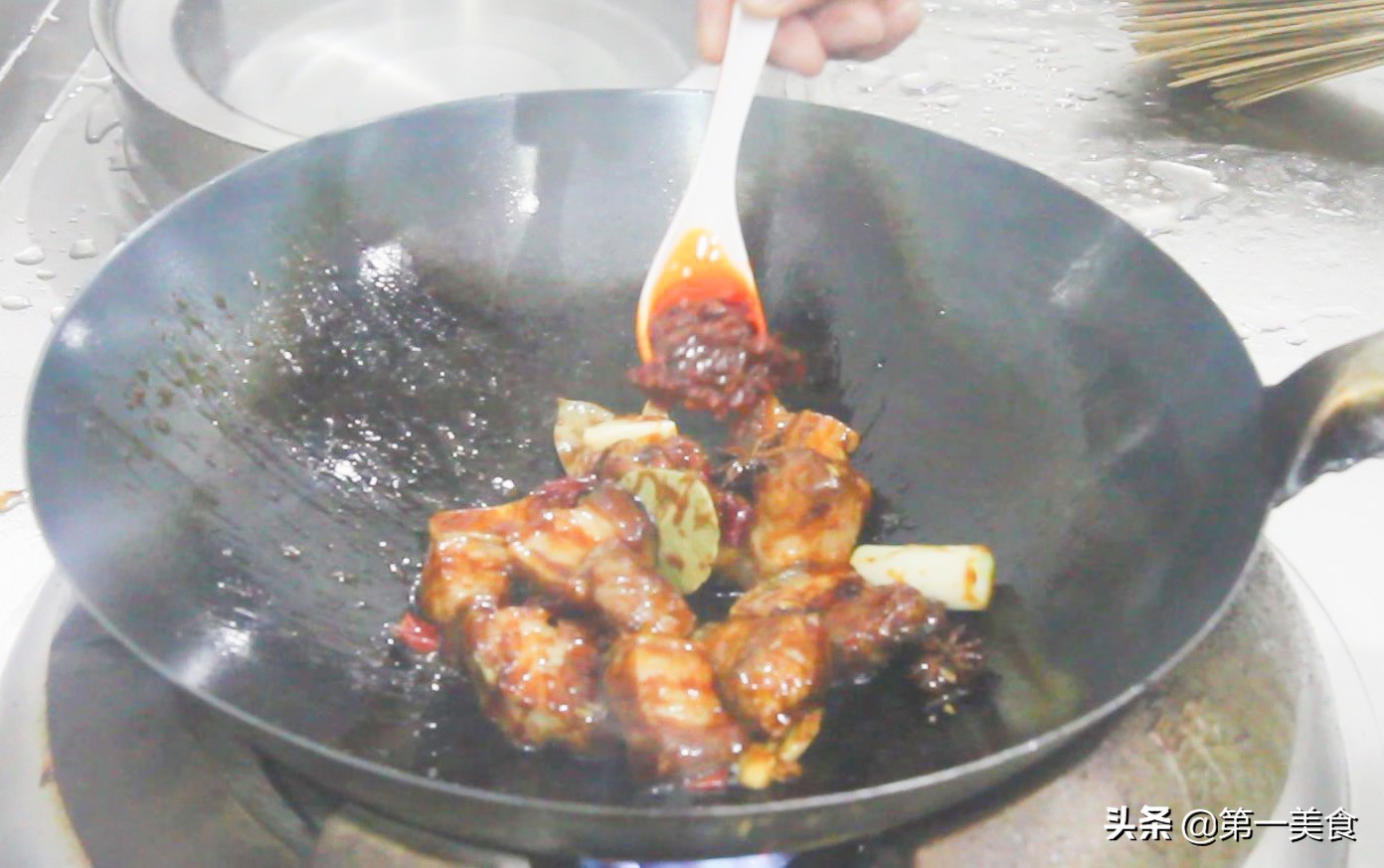 材料:八角2个、干辣椒若干、香叶2片、桂皮1小片、小茴香1克、冰糖6克、豆瓣酱、料酒、胡椒粉、鸡粉、十三香
