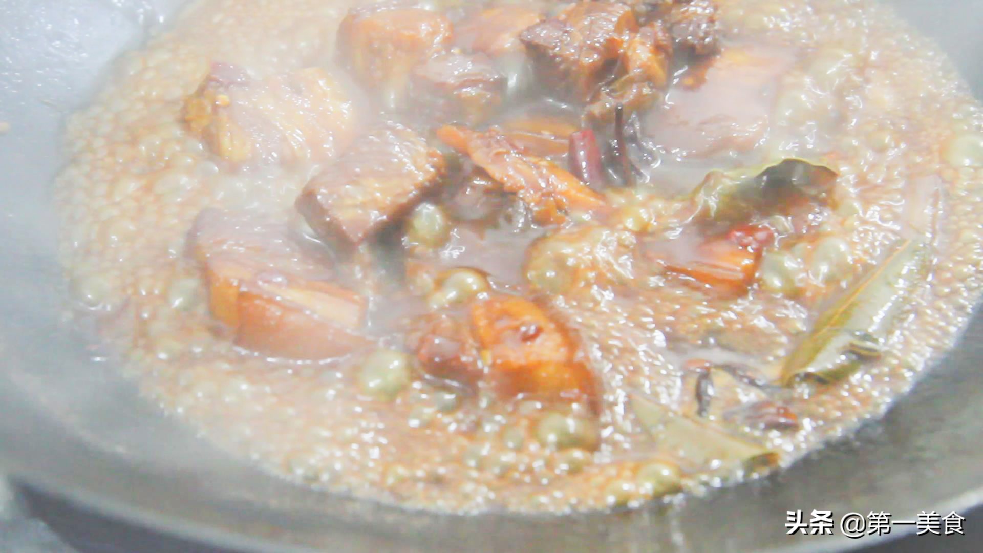第四步:现在开始熬糖色,开小火放入一小把冰糖,待冰糖慢慢化开变成红褐色起泡的时候倒入五花肉,快速翻炒让糖色裹匀五花肉,开始倒入葱、姜、蒜事先准备好的佐料进行翻炒,翻炒1分钟倒入豆瓣酱和料酒,加入清水使水没过五花肉,等待水沸腾后加入胡椒粉、鸡粉、十三香,盖上盖子开小火煮制40分钟。