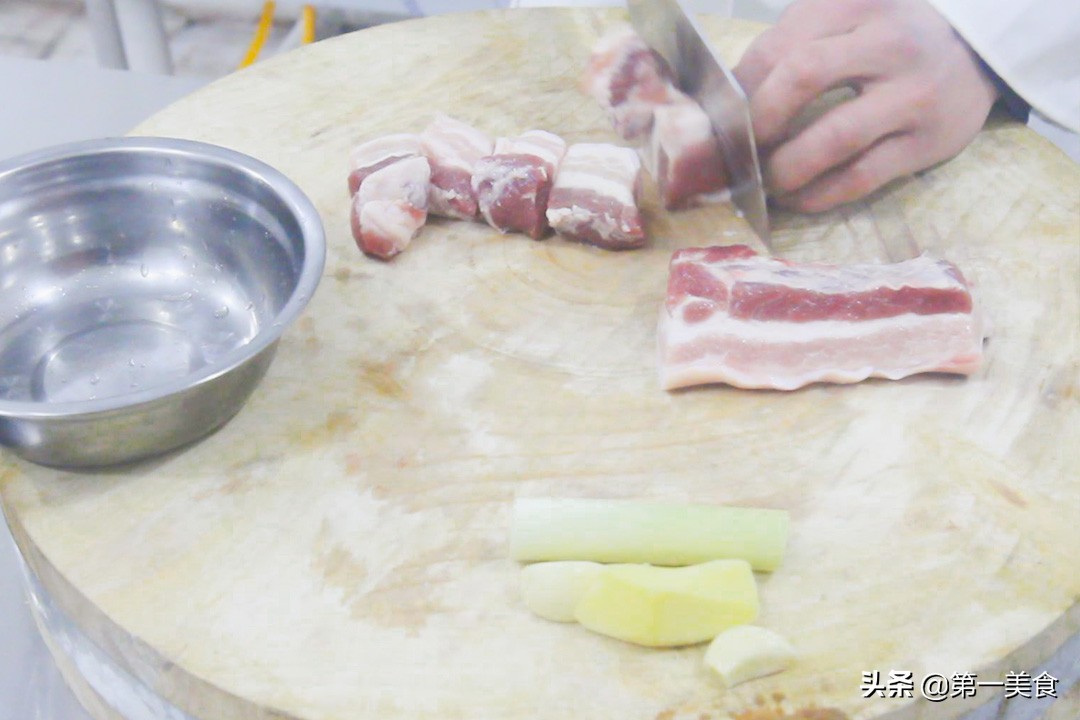 第一步:五花肉切成2厘米左右的方丁,切两个2厘米左右的葱段,把姜蒜轻轻拍扁不能太散哦。