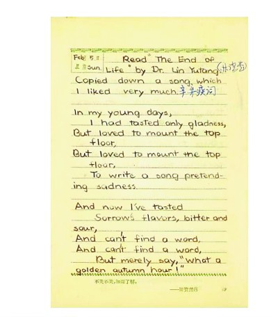 补记:这是我刚满十八岁译成英文的第一首诗……第一次译诗自得其乐,还有一点小小得意呢!