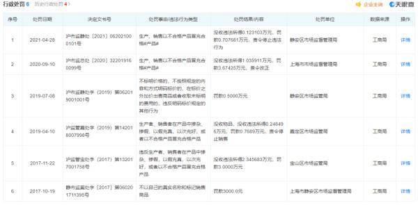 因不以自己的真实名称和标记销售商品,被上海市静安区市场监督管理局罚款3000元。同年11月22日,被宝山区市场监管局没收违法所得2.345683万元,罚款3万元。