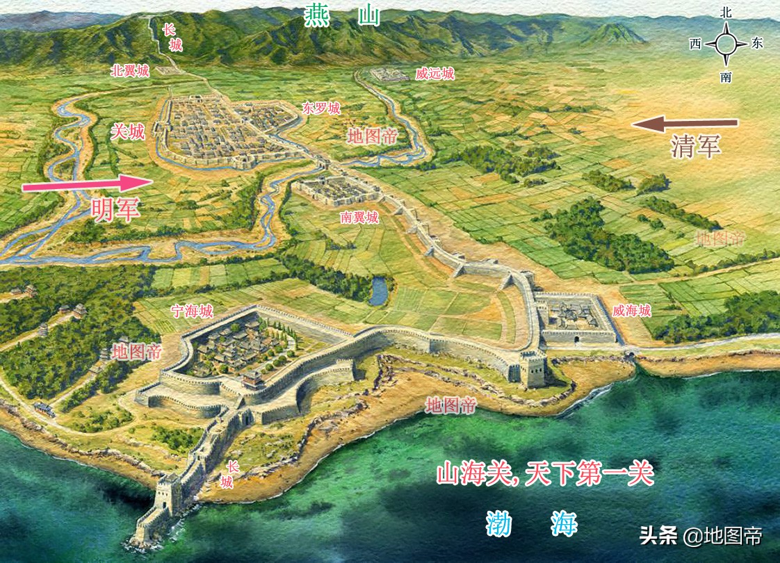 两京锁钥无双地,万里长城第一关。山海关,号称天下第一关,在辽西走廊的南端,最窄的地方,城池坚固,扼守辽西走廊,一夫当关万夫莫开,自古以来就是兵家必争之地。山海关夹在明朝京师(北京)和满清盛京(沈阳)之间,和二者之间的距离都在四百公里左右。无论对明朝还是对清朝,山海关都至关重要,明军守住山海关,就可以御敌于关外;清军若得山海关,京师门户大开,无险可守,整个华北平原都将如无人之境。