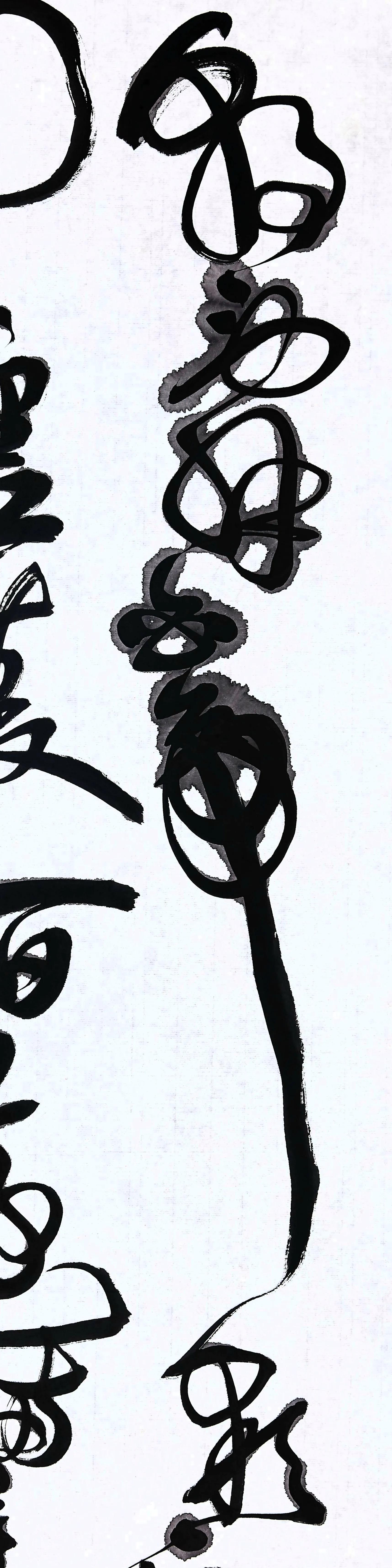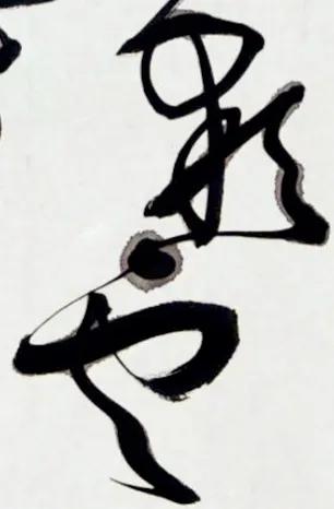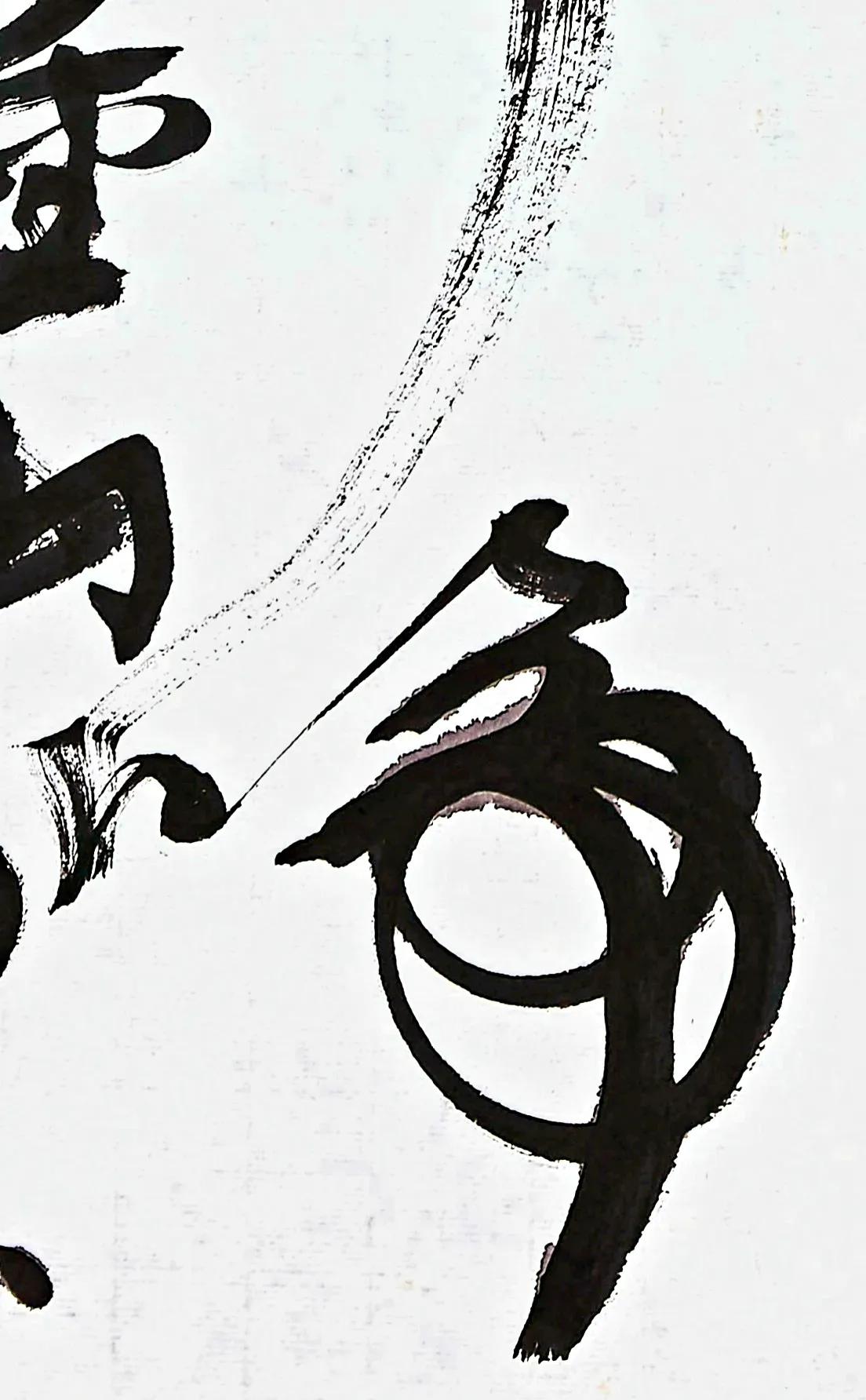 什么是狂草的笔锋?笔画按下去后提得起来,仍然能写出连续的尖利细线,就是笔锋。不是画出烂草绳一样的疯狂线条就算狂草了,大狂草与鬼画符的区别就看是否有笔锋。本幅狂草中字字相连的笔锋极多,尤其是一个一米多长的“声”字长线条收笔时笔毫已经铺开,但连接写“啼”字的左旁“口”后还能收拢拉出细如头发的劲利笔锋继续写完啼字。(图2)