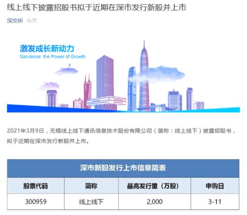 这是一家即将登陆创业板的移动信息服务提供商,全名叫“无锡线上线下通讯信息技术股份有限公司”。公司公告称,拟于近期在深市发行新股并上市,申购日为3月11日,计划最高发行量为2000万股,占公司发行后股份总数的25.00%。
